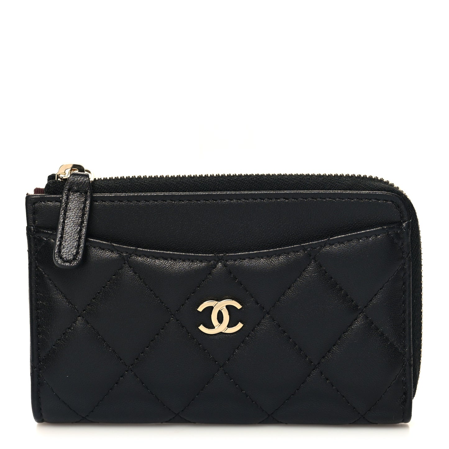 This is an authentic CHANEL Lambskin Quilted Zip Card Holder in Black. This simple and very chic cardholder is crafted of luxurious lambskin leather in black. It features a light gold Chanel CC logo on the front pocket, and 4 card slots on the rear and the top zipper opens to a burgundy fabric interior.Follow this item for alerts. Chanel is a registered trademark of Chanel. FASHIONPHILE is not affiliated with Chanel.