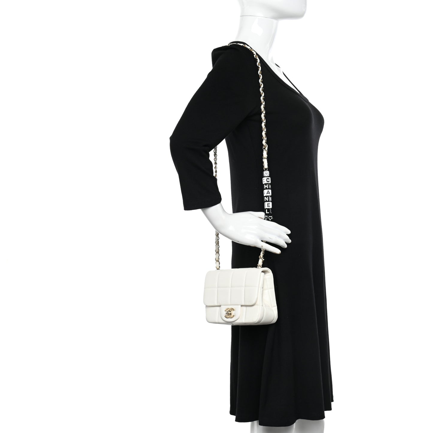 This is an authentic CHANEL Lambskin Resin Crystal Square Quilted Monacoco Mini Square Flap in White. The chic mini crossbody classic is crafted in soft square quilted lambskin leather in white. The bag features a gold chain link leather threaded shoulder strap with 8 resin cubes that spell out Chanel and a classic gold CC turn lock. This opens the flap to a white leather interior with zipper and patch pockets.