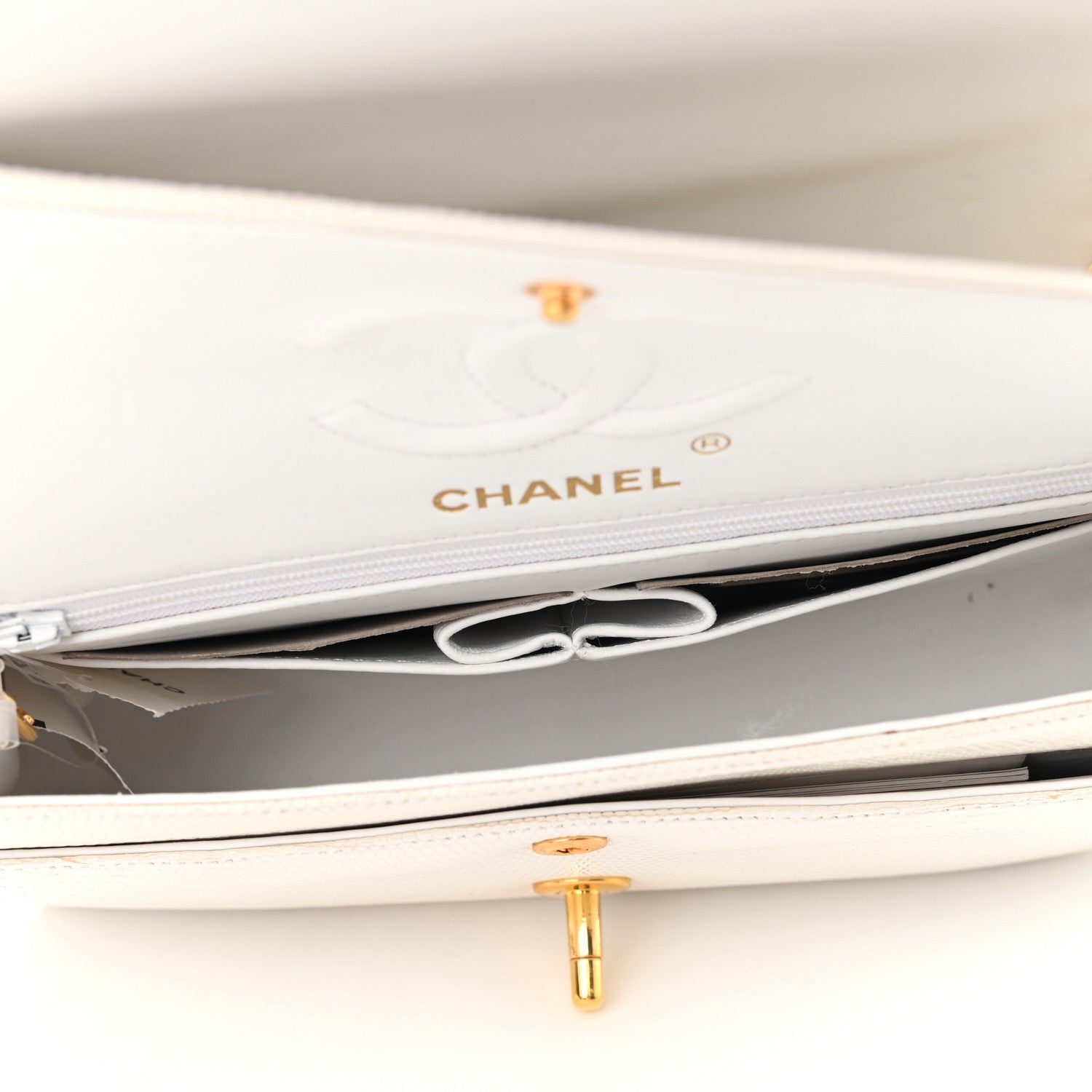 This is an authentic CHANEL Caviar Quilted Small Double Flap in White. This bag is crafted of white lizard leather. The bag features a leather threaded gold chain shoulder strap and a gold plated Chanel CC turn lock. This opens to a matching leather interior with pockets.Follow this item for alerts. Chanel is a registered trademark of Chanel. FASHIONPHILE is not affiliated with Chanel.