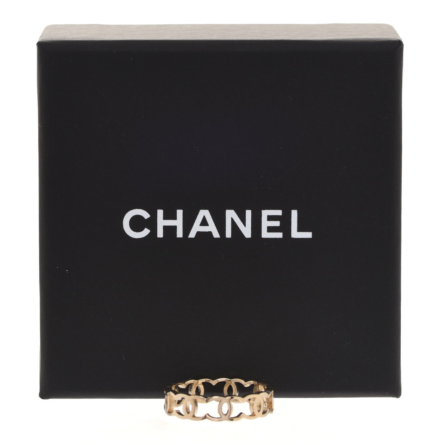 This is an authentic CHANEL Metal CC Ring size 54 or 6.75 in Gold. This stylish ring is a simple chain of gold metal engraved Chanel CC logos.Follow this item for alerts. Chanel is a registered trademark of Chanel. FASHIONPHILE is not affiliated with Chanel.