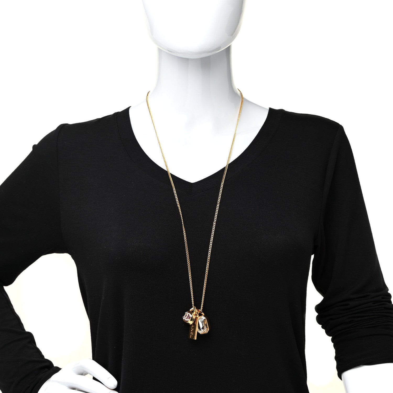 This is an authentic CHANEL Metal Crystal Charm Necklace in Purple and Gold. This long gold necklace features three charms engraved with the Chanel name.
