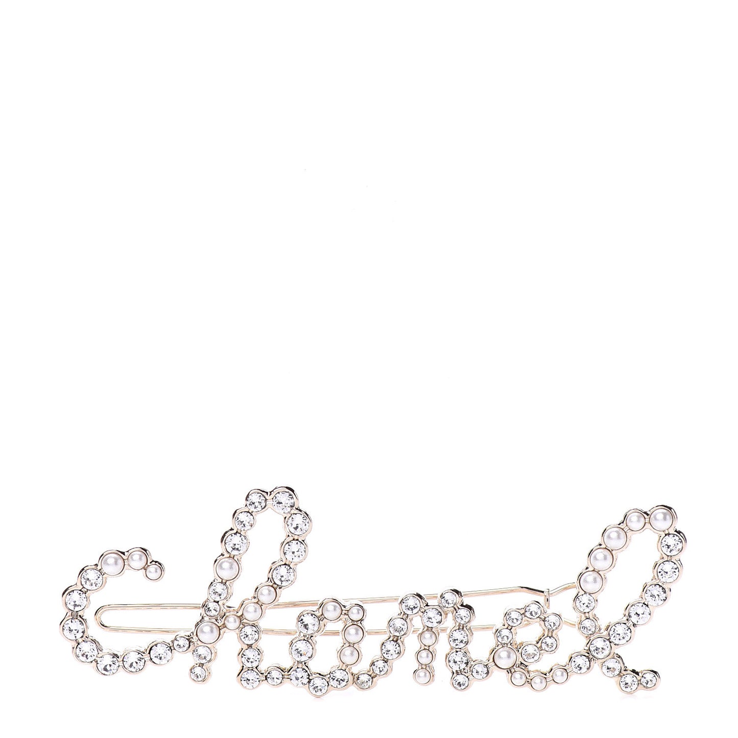 This is an authentic CHANEL Metal Glass Swirling Pearls Hair Clip in Gold. This stunning brooch is gold and spells Chanel in alternating crystals and faux pearls. This is a superb brooch with a timeless style only from Chanel!Follow this item for alerts. Chanel is a registered trademark of Chanel. FASHIONPHILE is not affiliated with Chanel.
