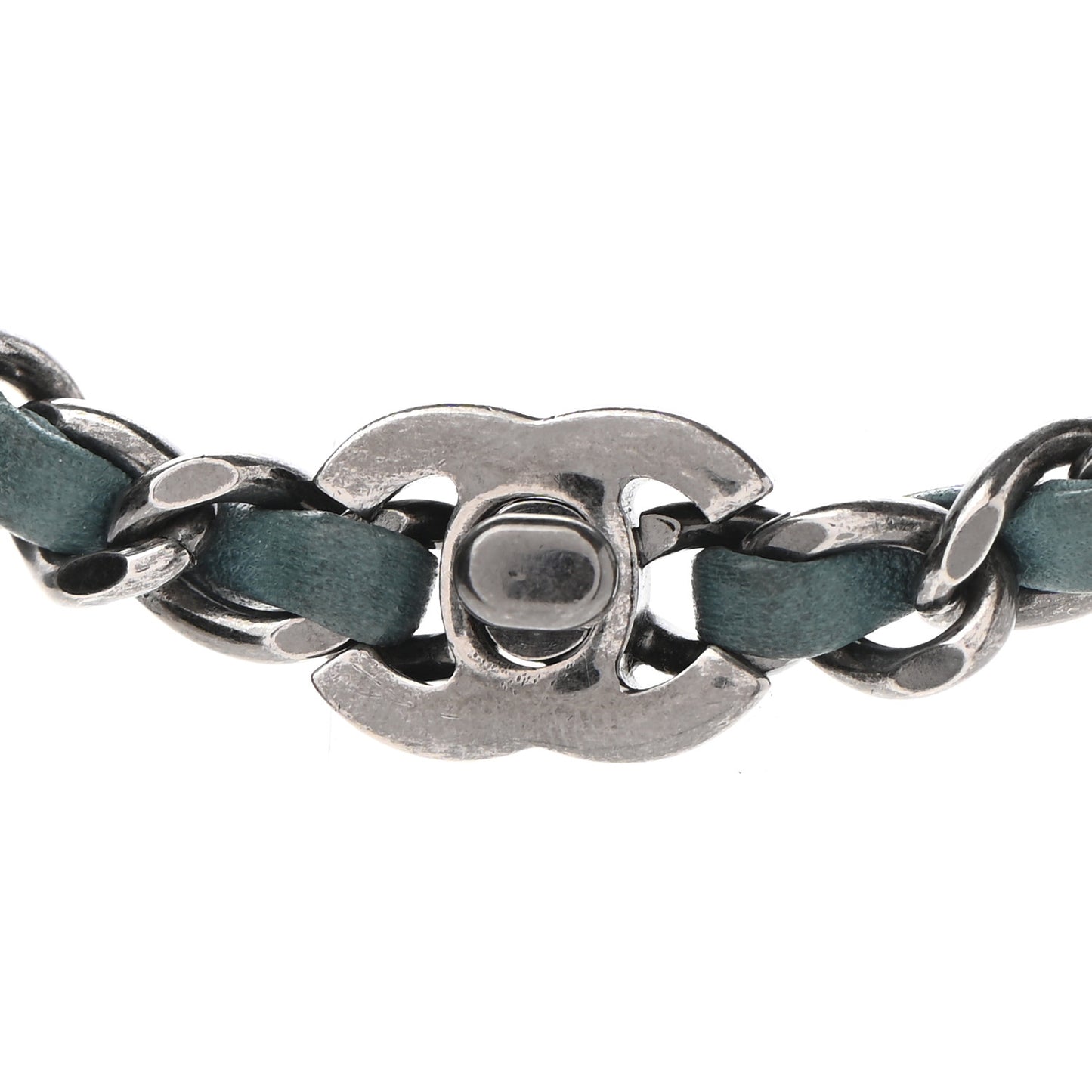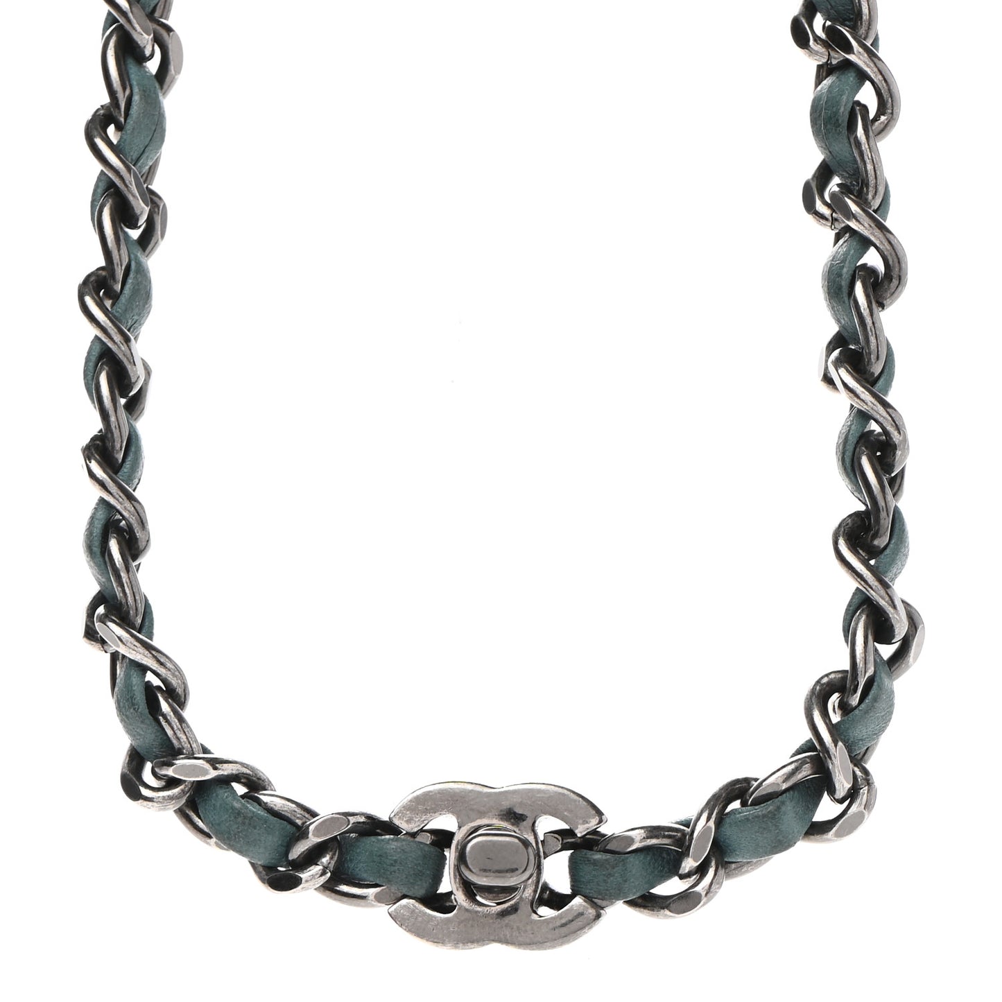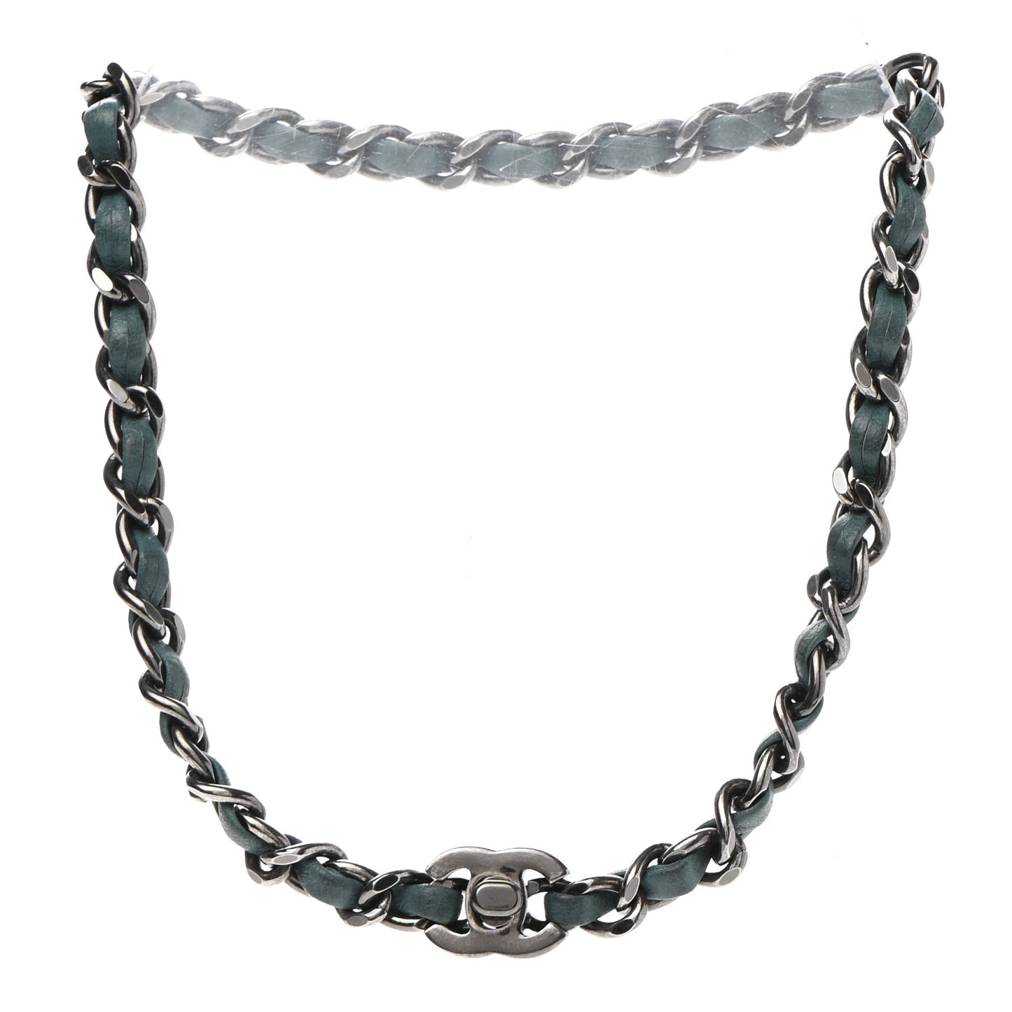 This is an authentic CHANEL Metal Lambskin CC Chain Turn Lock Choker Necklace in Turquoise. This stylish choker necklace is crafted of aged silver chain links and leather. It features a Chanel CC turn lock for closure.Follow this item for alerts. Chanel is a registered trademark of Chanel. FASHIONPHILE is not affiliated with Chanel.