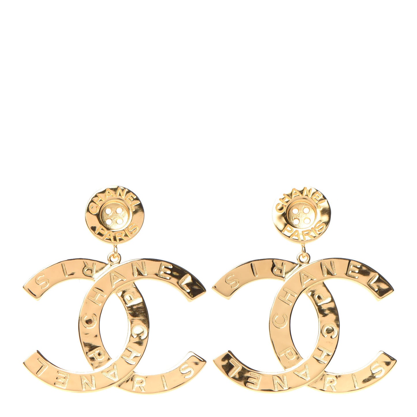 This is an authentic pair of CHANEL Metal Large Paris Button Earrings in Gold. These stylish earrings are crafted in a gold tone large Chanel CC logo suspended from a button shaped piece.Follow this item for alerts. Chanel is a registered trademark of Chanel. FASHIONPHILE is not affiliated with Chanel.