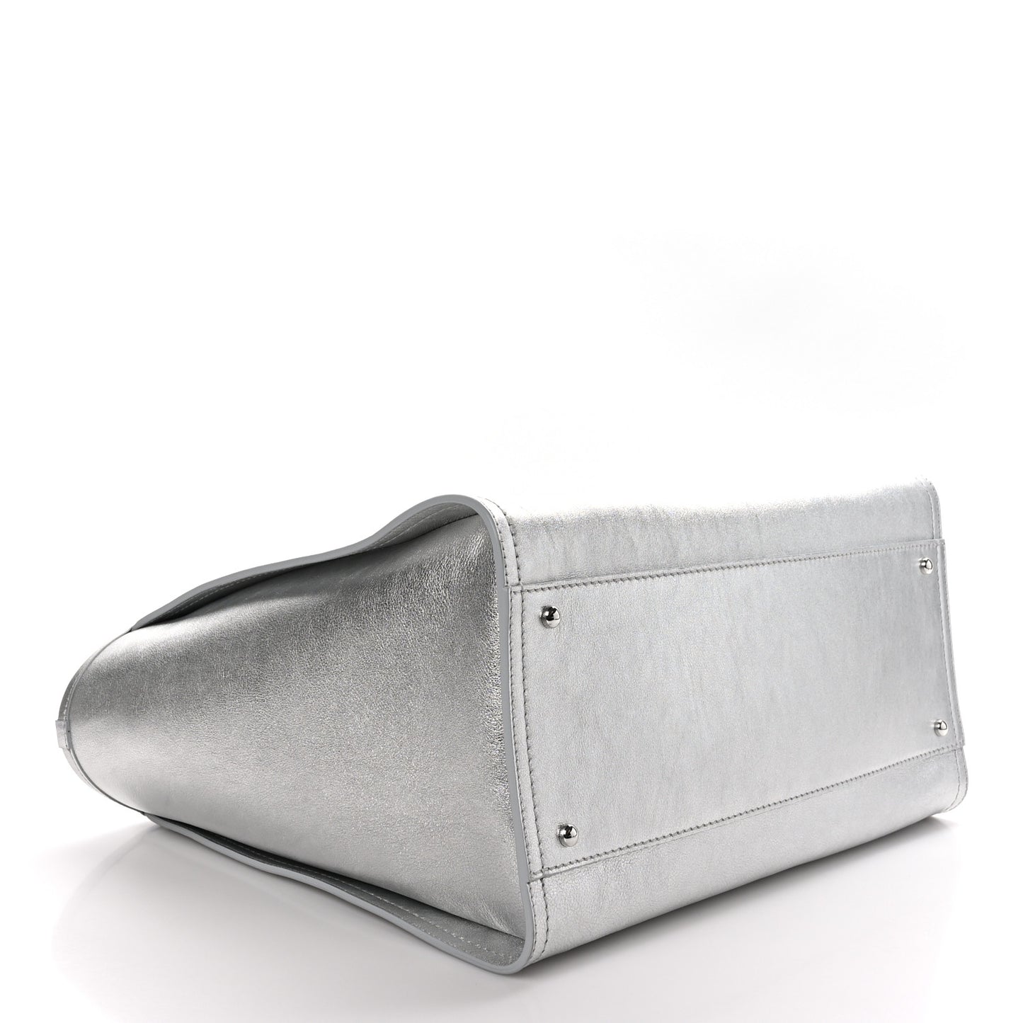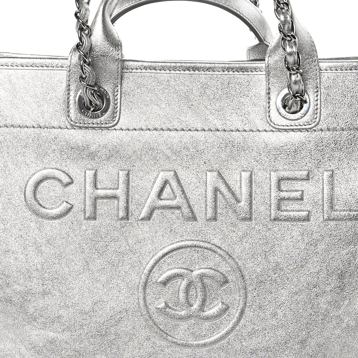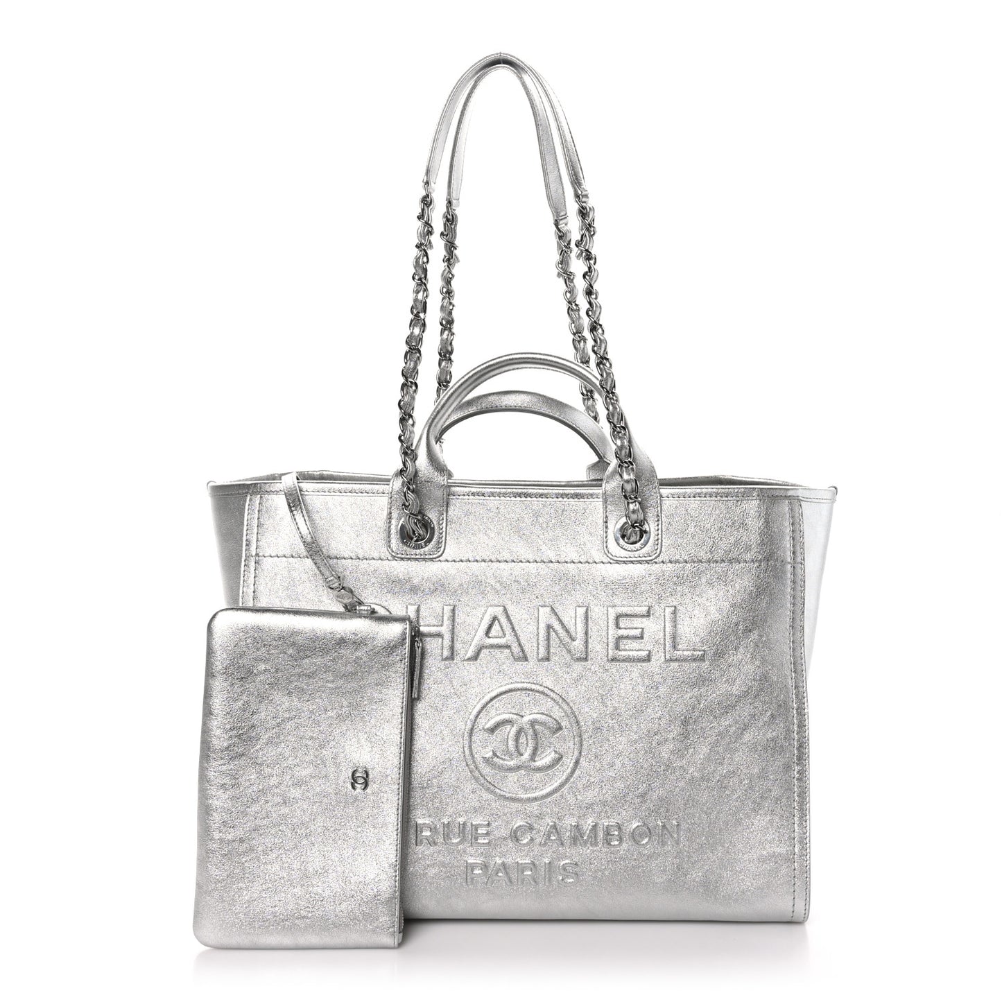 This is an authentic CHANEL Metallic Calfskin Medium Deauville Tote in Silver. This stylish handbag is crafted of metallic calfskin leather in silver with a Chanel advertisement logo on the front. The bag features matching rolled top handles, silver chain leather threaded shoulder straps, and silver hardware. The top opens to a beige fabric interior with zipper and patch pockets.Follow this item for alerts. Chanel is a registered trademark of Chanel. FASHIONPHILE is not affiliated with Chanel.