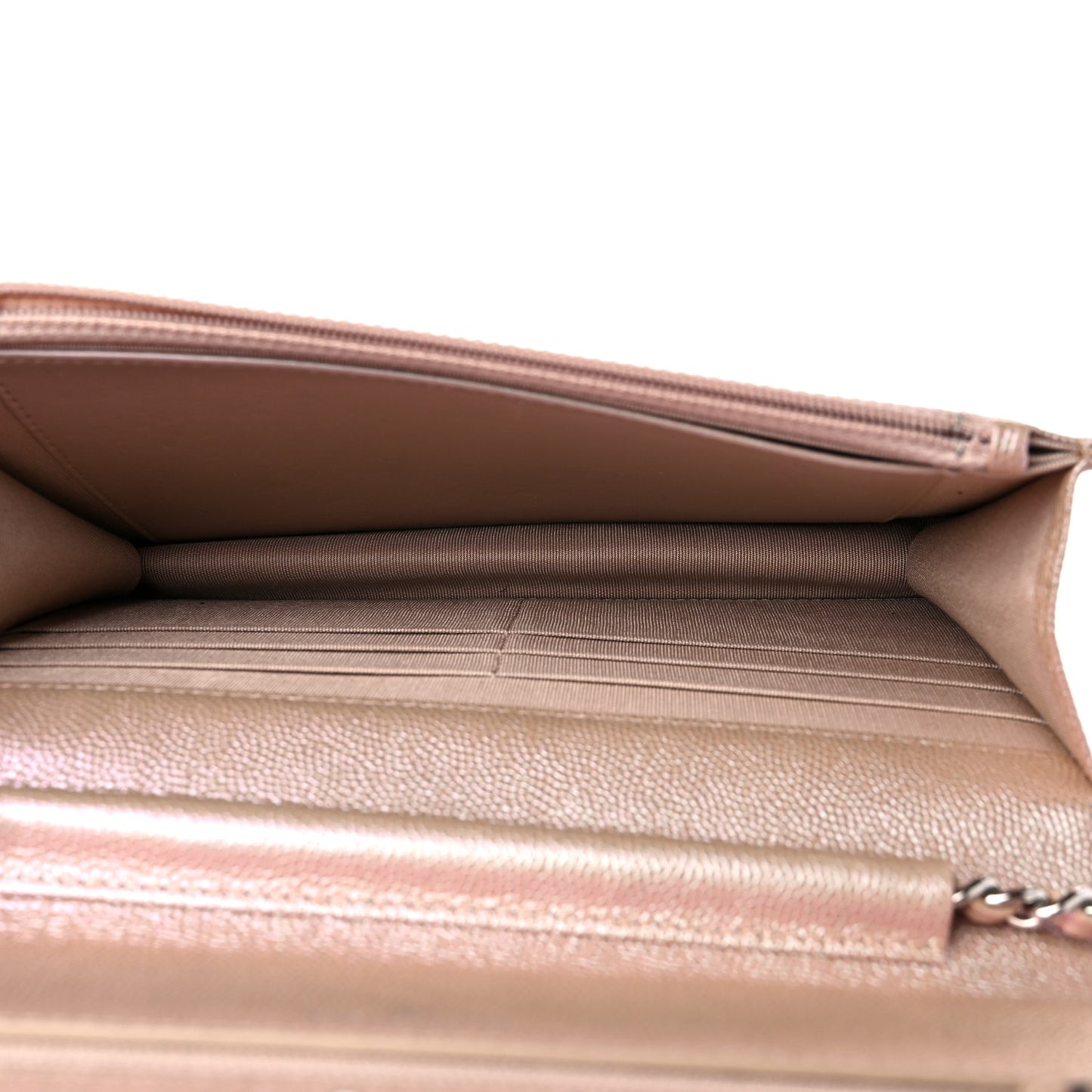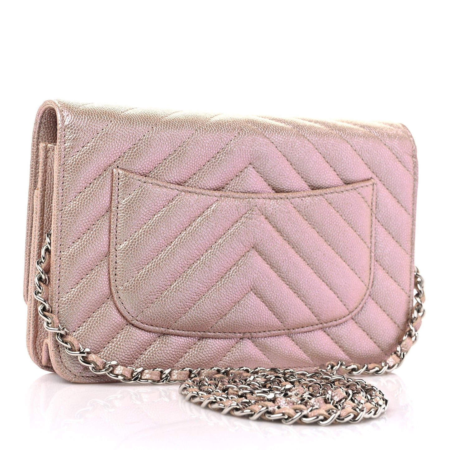 This is an authentic CHANEL Metallic Caviar Chevron Quilted Wallet On Chain WOC in Light Gold. This stylish shoulder bag is crafted of luxurious chevron-quilted caviar leather in iridescent pink-gold. The bag features a long silver chain link leather threaded shoulder strap and a frontal silver Chanel CC logo. This wallet unsnaps to a beige fabric interior with a panel of card slots, flat pockets, and a zippered compartment.Follow this item for alerts. Chanel is a registered trademark of Chanel. FASHIONPHILE is not affiliated with Chanel.