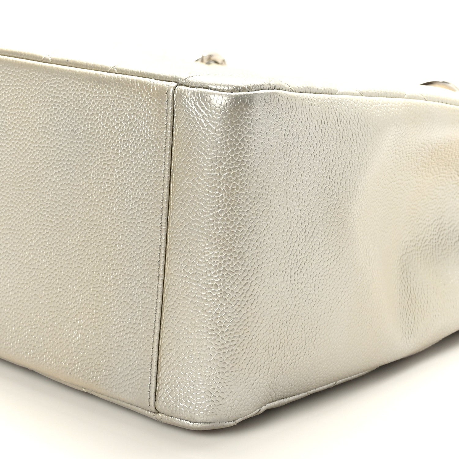 This is an authentic CHANEL Metallic Caviar Quilted Grand Shopping Tote GST in Pearl. This stylish tote is crafted of diamond quilted caviar leather in pearl. This shoulder bag features leather threaded polished silver chain-link shoulder straps with shoulder pads, a quilted Chanel CC logo on the front, and a flat pocket on the rear. The top opens to a partitioned beige fabric interior, a central zippered section as well as patch and zipper pockets.Follow this item for alerts. Chanel is a registered trademark of Chanel. FASHIONPHILE is not affiliated with Chanel.