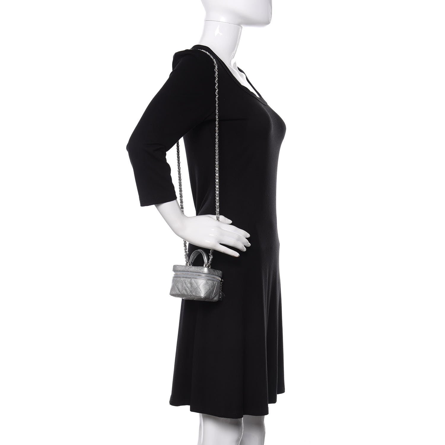 Metallic Caviar Quilted Mini Top Handle Vanity With Chain Silver