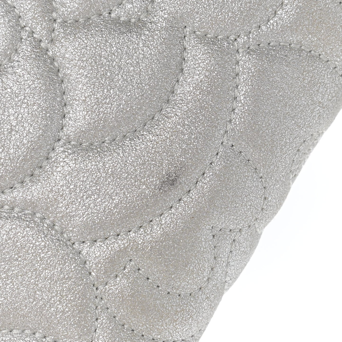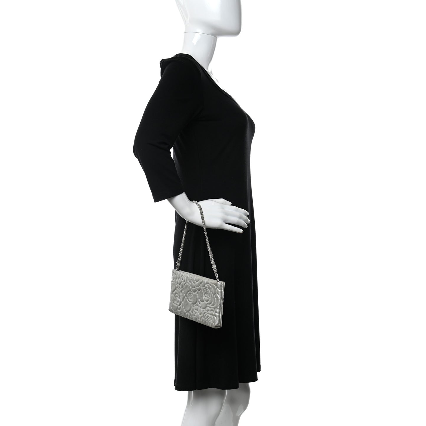 This is an authentic CHANEL Metallic Lambskin Camellia Chain Pouch in Silver. This stylish chain wallet is finely crafted of camellia embossed lambskin leather in metallic silver. The handbag features a leather threaded chain link shoulder strap and and opens to a beige camellia quilted interior.Follow this item for alerts. Chanel is a registered trademark of Chanel. FASHIONPHILE is not affiliated with Chanel.