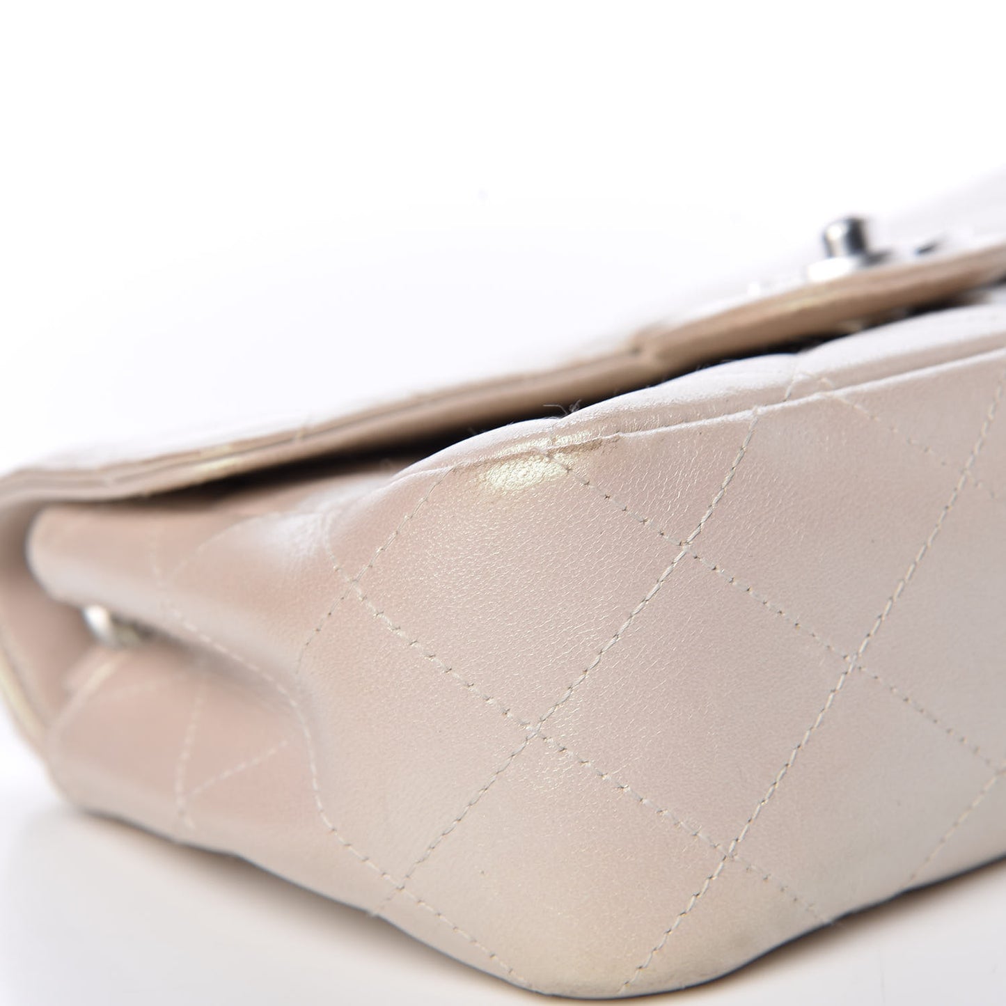 This is an authentic CHANEL Metallic Lambskin Quilted Extra Mini Rectangular Flap in Ivory. This stylish crossbody bag is crafted of diamond quilted lambskin leather with an iridescent luminous sheen. The bag features a polished silver chain-link shoulder strap threaded with leather, a rear pocket, and a polished silver classic Chanel CC turn lock. This opens to a compact white leather interior with a patch pocket. This is a perfect shoulder bag for day or evening, only from Chanel!Follow this item for alerts. Chanel is a registered trademark of Chanel. FASHIONPHILE is not affiliated with Chanel.