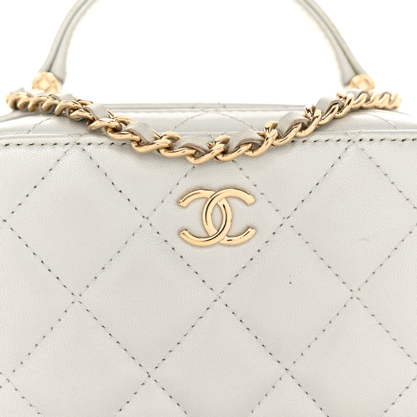 Chanel/ Bags/ Travel & Luggage /Chanel Metallic Lambskin Quilted Top Handle Vanity Case Silver