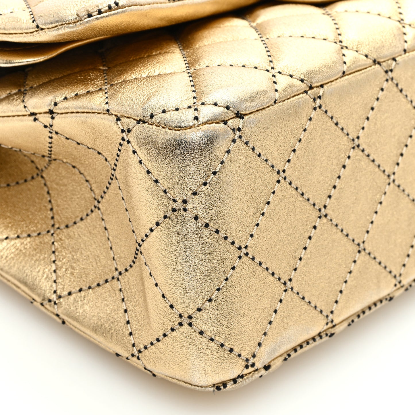 Metallic Washed Lambskin Quilted Jumbo Double Flap Dark Gold