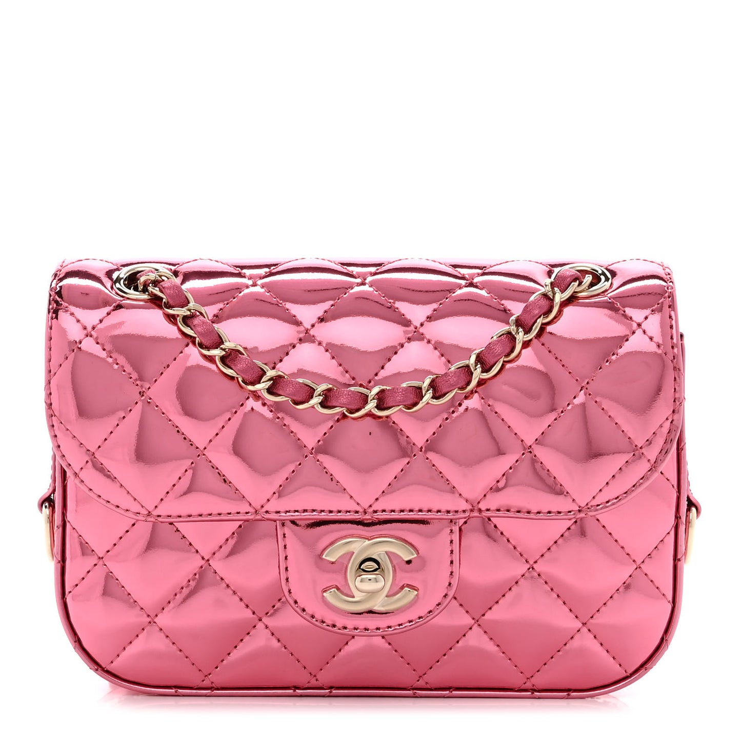 This is an authentic CHANEL Mirror Calfskin Metallic Lambskin Quilted Hollywood Boulevard Mini Flap With Star Coin Purse in Pink. This stunning small crossbody shoulder bag is finely crafted of glossy diamond quilted metallic patent leather in pink. The bag features a chain link shoulder strap threaded with leather and a frontal flap with a Chanel CC turn lock. This opens to a compact leather interior with zipper and patch pockets and features a matching lambskin star coin purse.Follow this item for alerts. Chanel is a registered trademark of Chanel. FASHIONPHILE is not affiliated with Chanel.