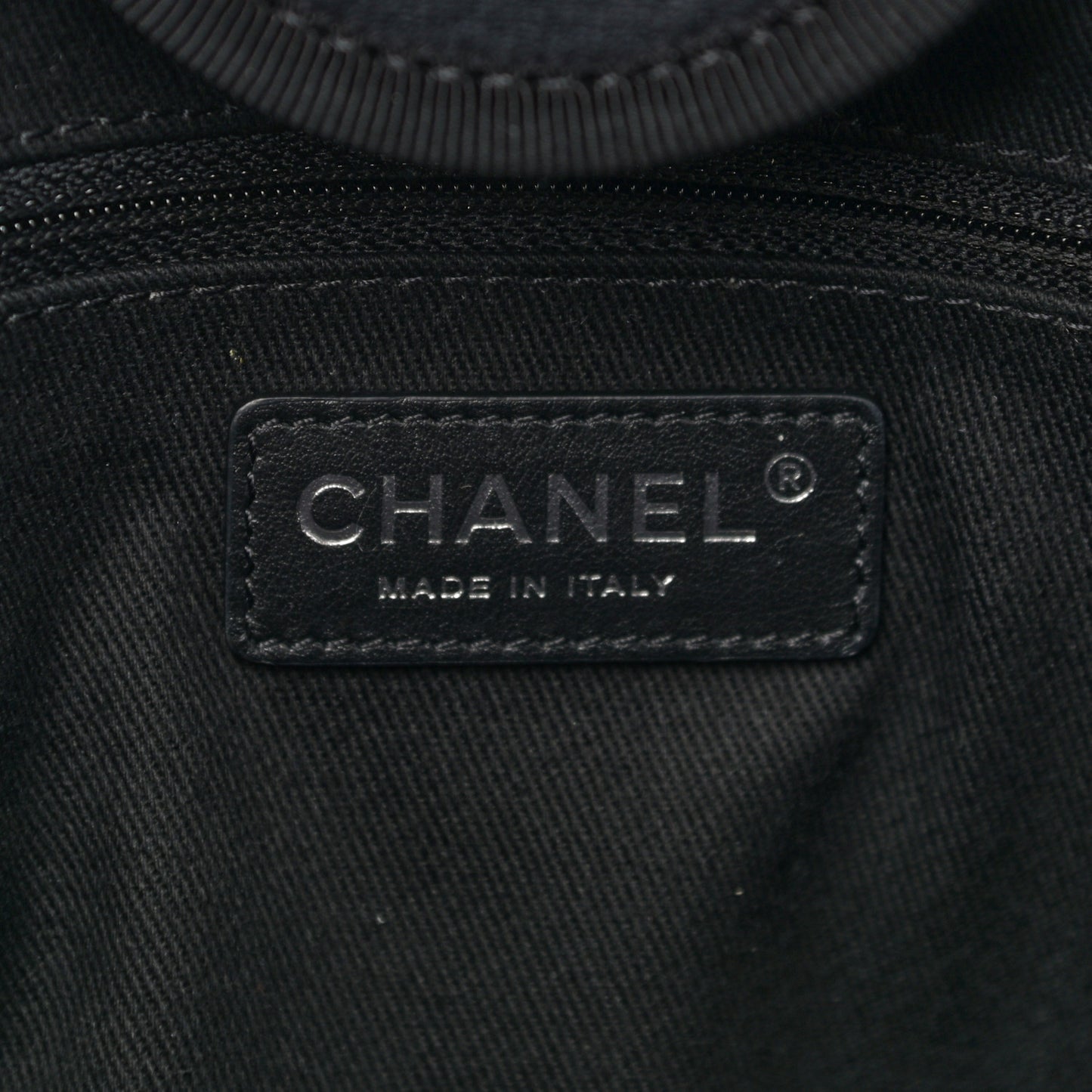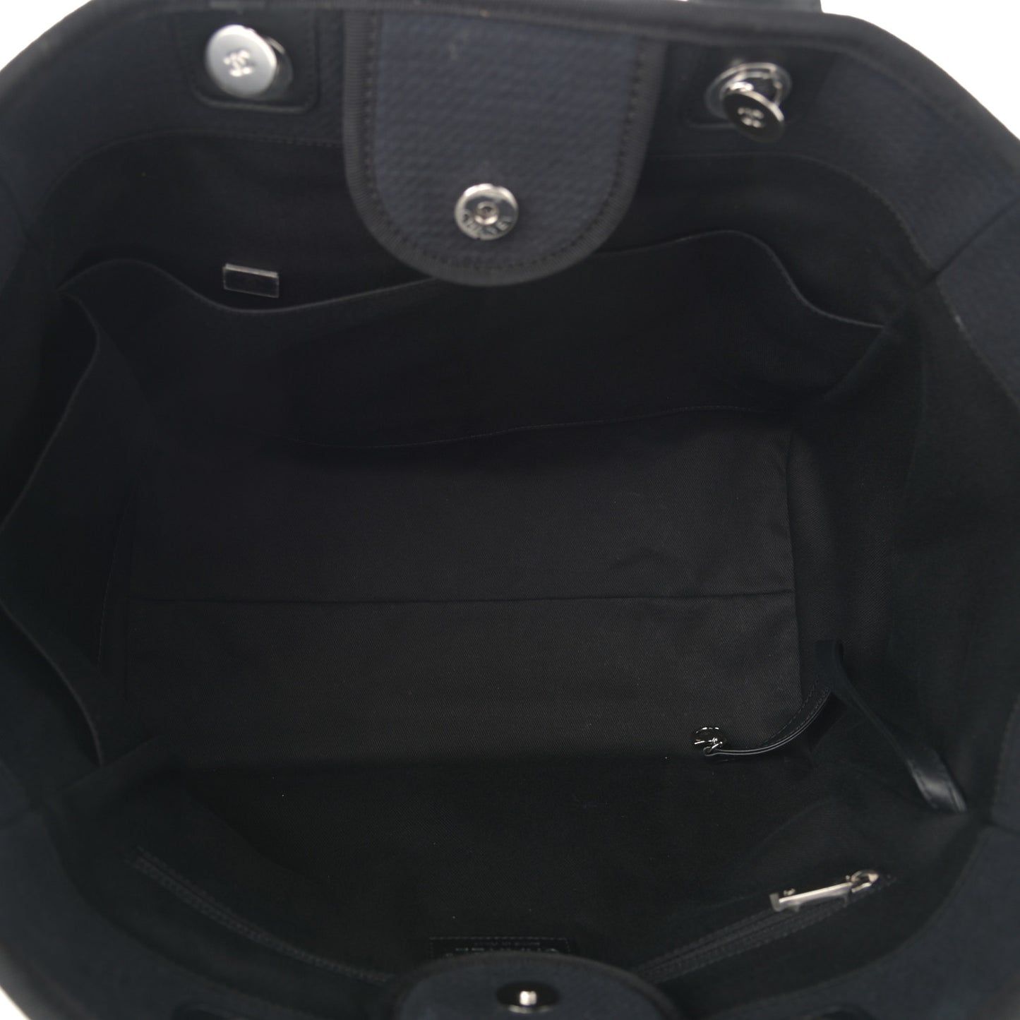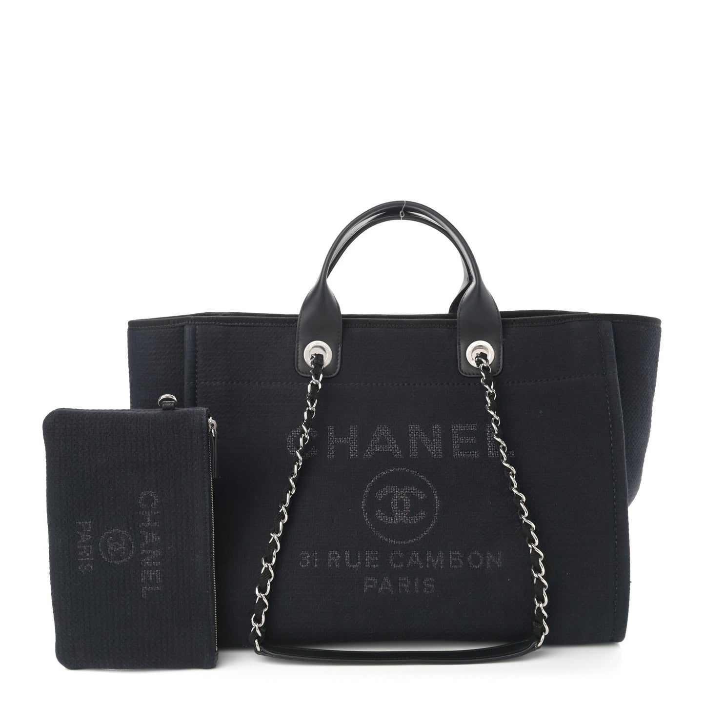 This is an authentic CHANEL Mixed Fibers Medium Deauville Tote in Black. This tote is crafted of mixed fibers in black with a black printed Chanel logo. The bag features silver chain link fabric-threaded shoulder straps with leather shoulder pads. The top opens to fabric interior with a removable pouch.Follow this item for alerts. Chanel is a registered trademark of Chanel. FASHIONPHILE is not affiliated with Chanel.