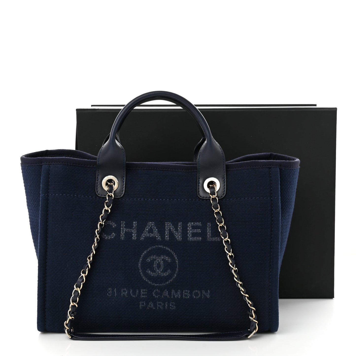 This is an authentic CHANEL Mixed Fibers Small Deauville Tote in Navy. This stylish handbag is crafted of fine fibers in blue with an embroidered Chanel Rue Cambon Paris logo. It features black rolled leather top handles, blue fabric top trim and blue threaded gold chain shoulder straps. The top is open to a beige fabric interior with patch pockets, a zipper pocket, and a removable pouch.Follow this item for alerts. Chanel is a registered trademark of Chanel. FASHIONPHILE is not affiliated with Chanel.