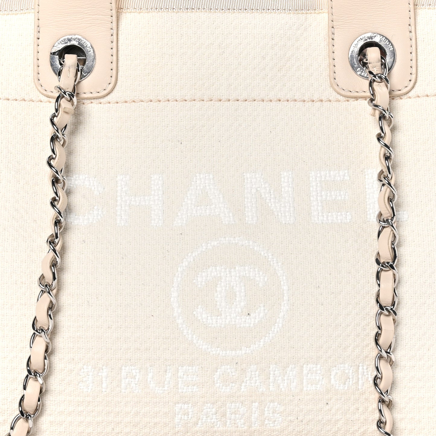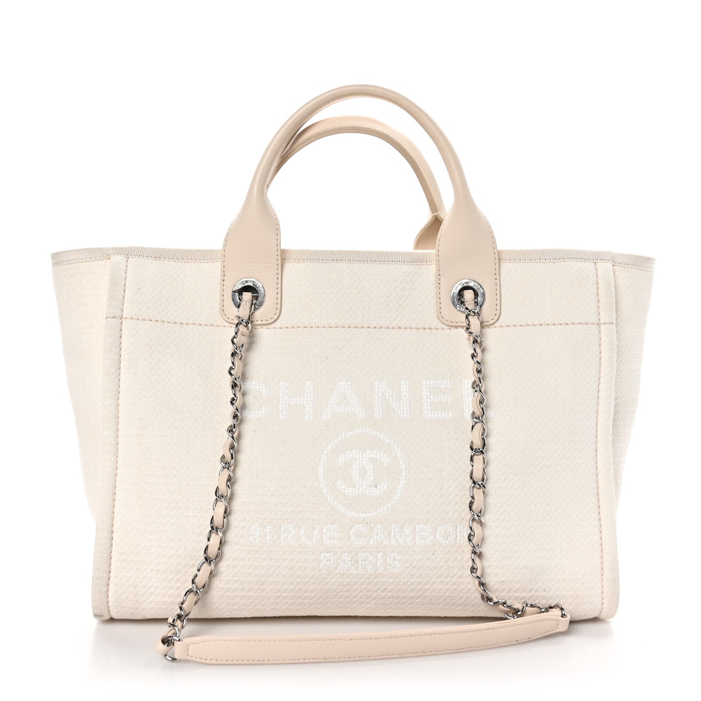 This is an authentic CHANEL Mixed Fibers Small Deauville Tote in White. This stylish shoulder bag is crafted of woven fibers in light beige, with a white Chanel Rue Cambon Paris logo on the front. The bag features beige fabric trim, white leather handles, and beige leather-threaded polished gold chain link shoulder straps. The top is open to a beige fabric interior with zipper and patch pockets and a matching removable pouch.Follow this item for alerts. Chanel is a registered trademark of Chanel. FASHIONPHILE is not affiliated with Chanel.
