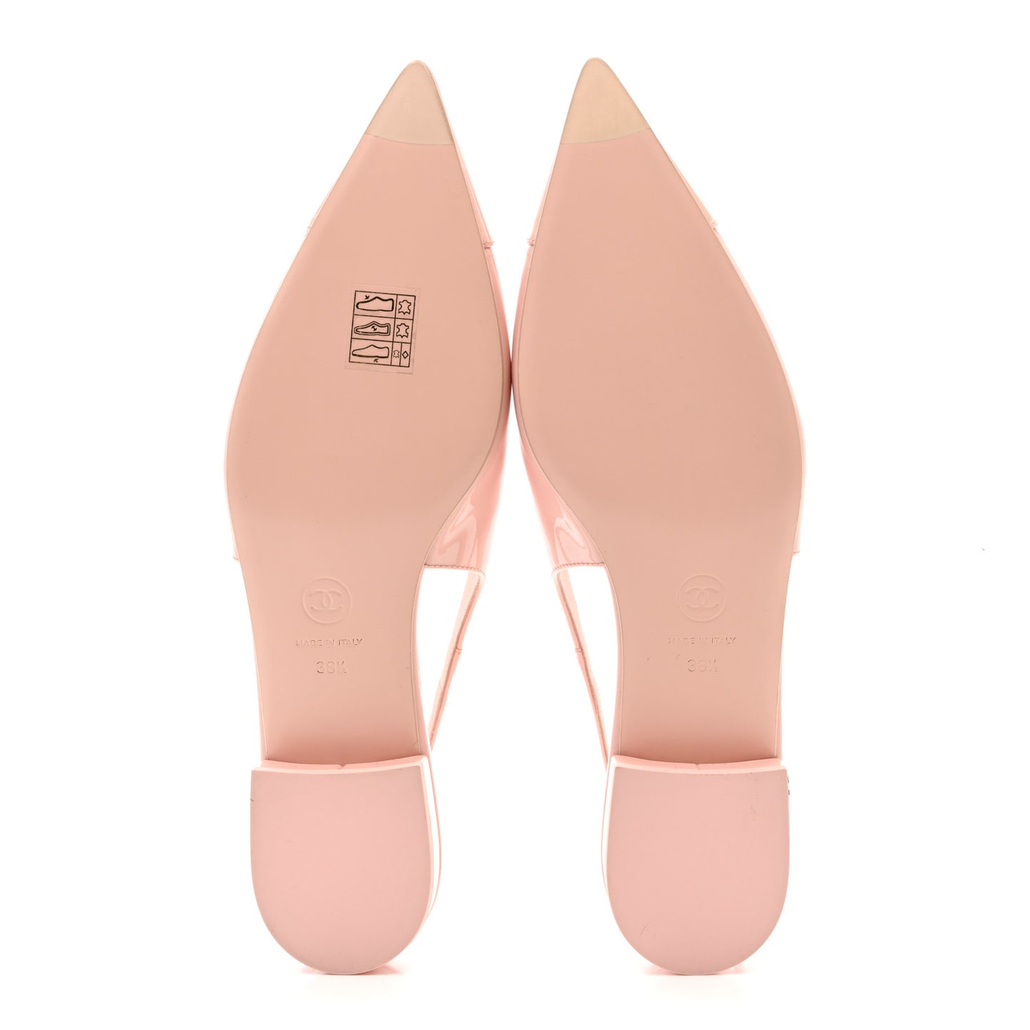 This is an authentic pair of CHANEL Patent Calfskin Cap Toe Slingback Flats size 38.5 in Light Pink. These chic slingback flats are crafted of patent calfskin in pink. They feature a pointed cap toe and a small silver Chanel logo on the heel.
