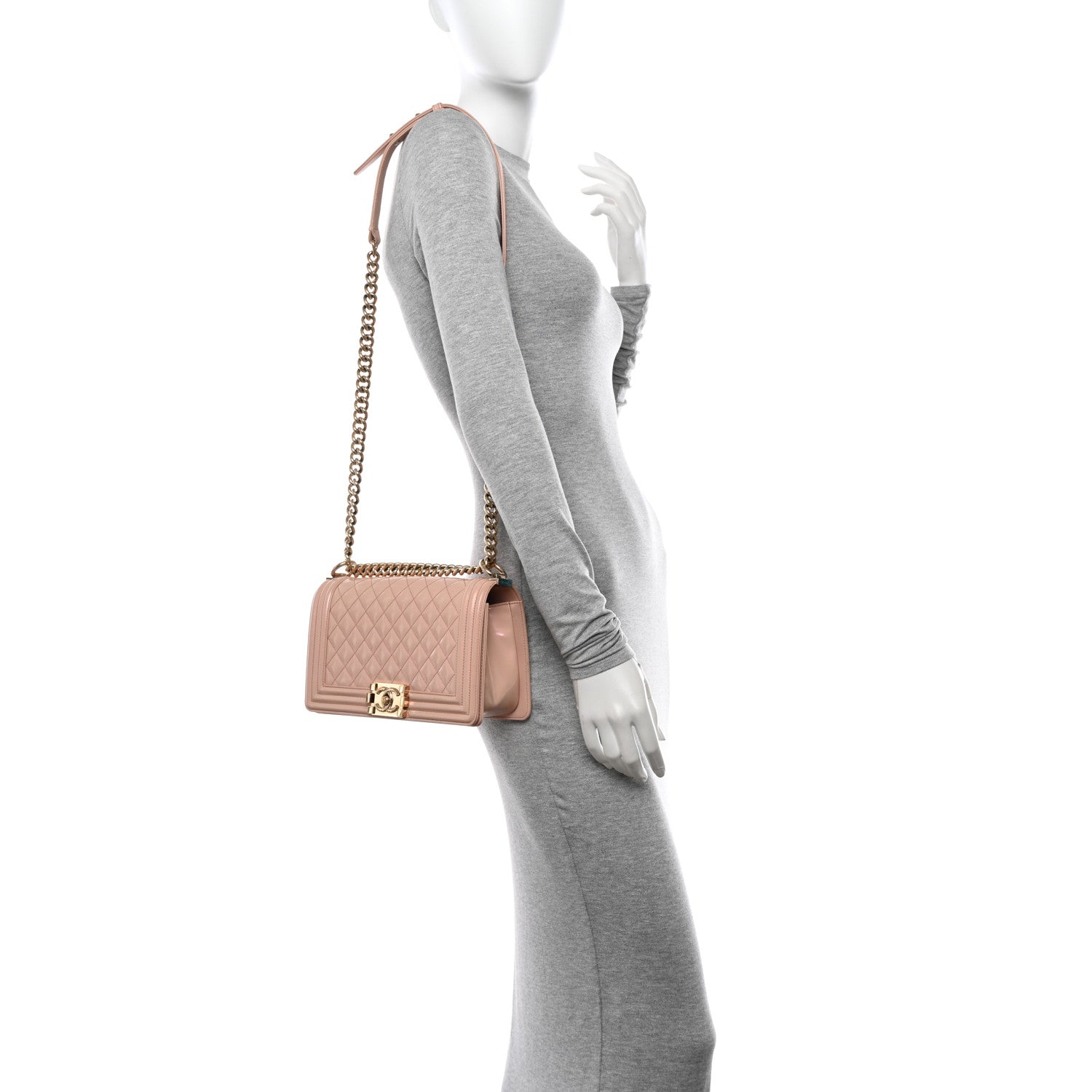 This is an authentic CHANEL Patent Calfskin Quilted Medium Boy Flap in Light Pink. This stylish shoulder bag in the medium size is crafted of shiny patent calfskin leather framed by a linear quilting. The bag features a polished gold chain link shoulder strap with a leather shoulder pad and a gold mademoiselle CC press lock. This opens to a champagne fabric interior with a flat pocket.Follow this item for alerts. Chanel is a registered trademark of Chanel. FASHIONPHILE is not affiliated with Chanel.