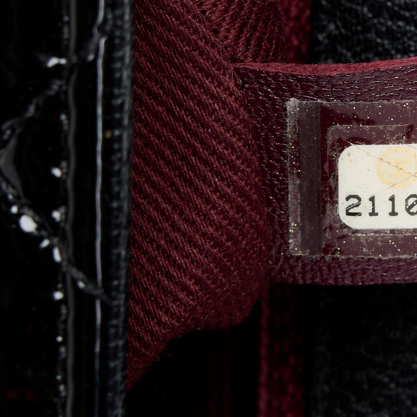 This is an authentic CHANEL Patent Goatskin Quilted Medium CC Eyelet Flap in Black. This chic classic is crafted of diamond-quilted patent leather in black, with matching goatskin leather side panels and base. The bag features a rear patch pocket, a leather-threaded aged gold chain link shoulder strap with a shoulder pad, and a dangling Chanel Paris charm. The crossover flap opens with an aged gold classic CC turn lock to a burgundy fabric interior with a zipper pocket.Follow this item for alerts. Chanel is a registered trademark of Chanel. FASHIONPHILE is not affiliated with Chanel.