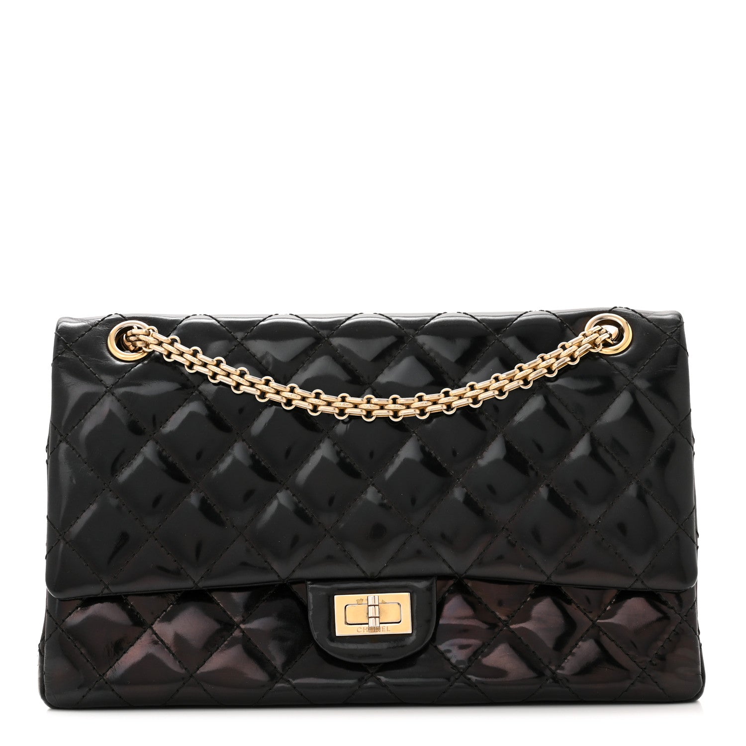 This is an authentic CHANEL Patent Quilted 2.55 Reissue 226 Flap in Black. This stylish shoulder bag is beautifully crafted of diamond quilted patent leather in black. The bag features a gold bijoux linked chain shoulder strap, a full-frontal flap, and a matching gold mademoiselle turn lock. This opens to reveal an inner flap and black leather interior with patch pockets.Follow this item for alerts. Chanel is a registered trademark of Chanel. FASHIONPHILE is not affiliated with Chanel.