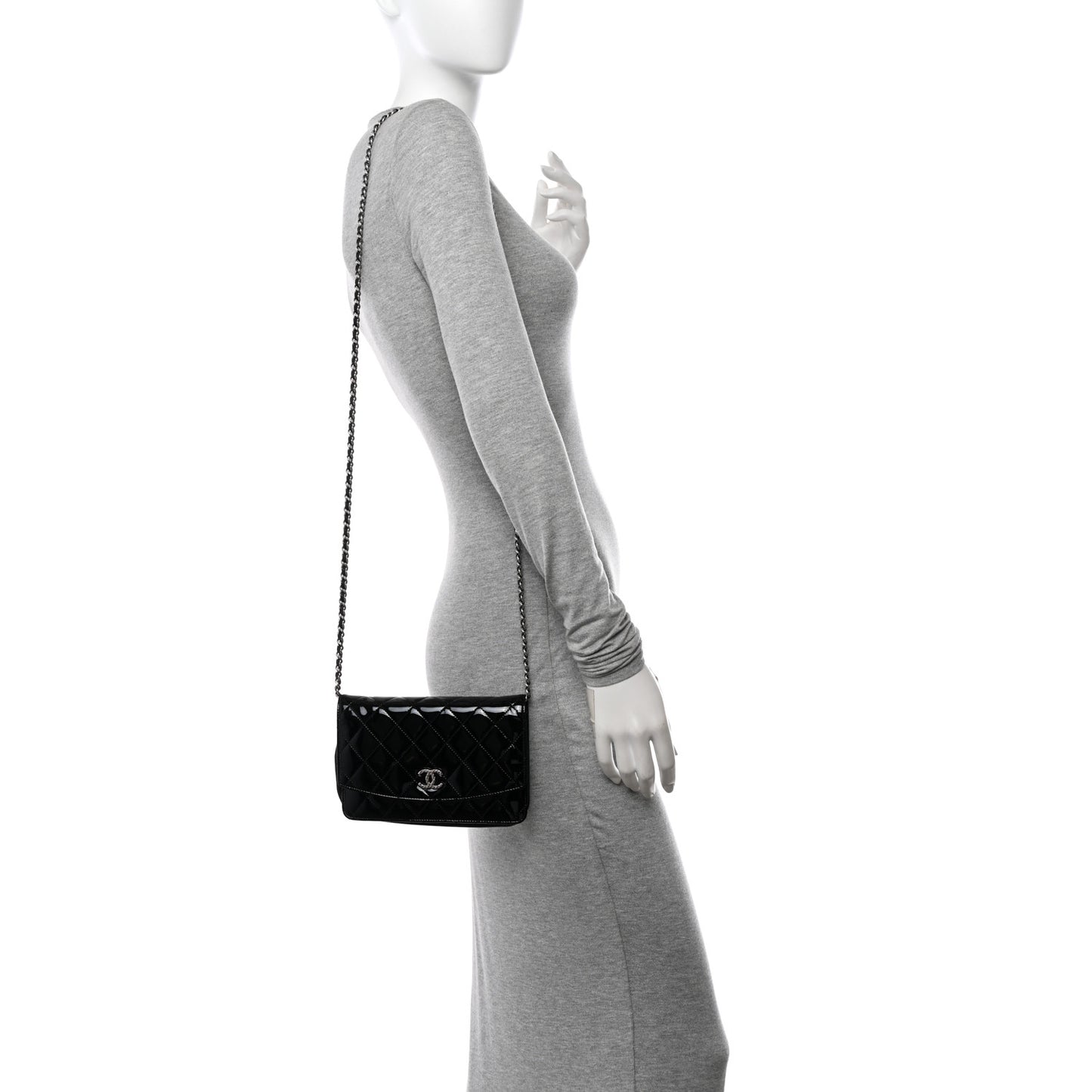 This is an authentic CHANEL Patent Quilted Brilliant Wallet On Chain WOC in Black. This stylish wallet on chain is crafted of luxuriously glossy diamond quilted patent leather in black. The shoulder bag features a below the waist polished silver leather threaded shoulder chain and a front flap with a textured silver faux Chanel CC logo. The front flap opens with a snap to a partitioned black leather and fabric interior with card slots, and a zipper compartment.Follow this item for alerts. Chanel is a registered trademark of Chanel. FASHIONPHILE is not affiliated with Chanel.