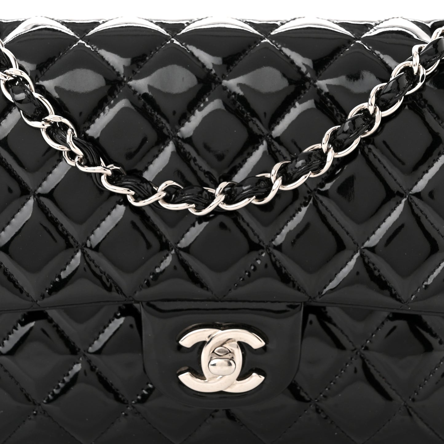 This is an authentic CHANEL Patent Quilted Medium Double Flap in Black. This classic shoulder bag is crafted of luxurious diamond quilted glossy patent leather in black. The bag features silver chain link leather threaded shoulder straps and a facing silver Chanel CC turn lock. This opens the facing flap to reveal an inner flap and a matte black leather interior with patch pockets.