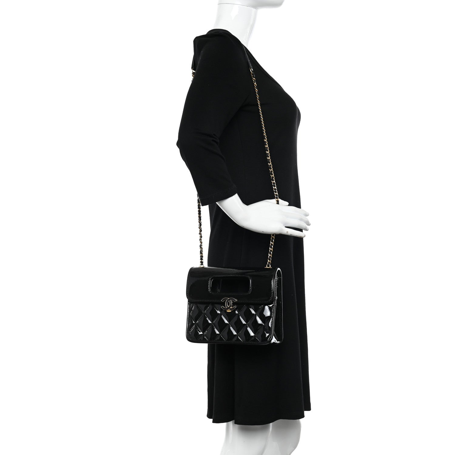 This is an authentic CHANEL Patent Quilted Mini Graphic Catch Flap in Black. This stunning small shoulder bag is finely crafted of diamond quilted patent leather in black. The bag features a cutout handle, an aged gold chain link shoulder strap threaded with leather and a frontal flap with an aged gold Chanel Classic CC press lock. This opens to a black leather interior with zipper and patch pockets.Follow this item for alerts. Chanel is a registered trademark of Chanel. FASHIONPHILE is not affiliated with Chanel.