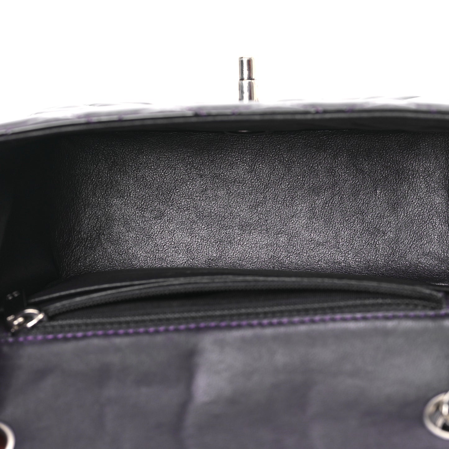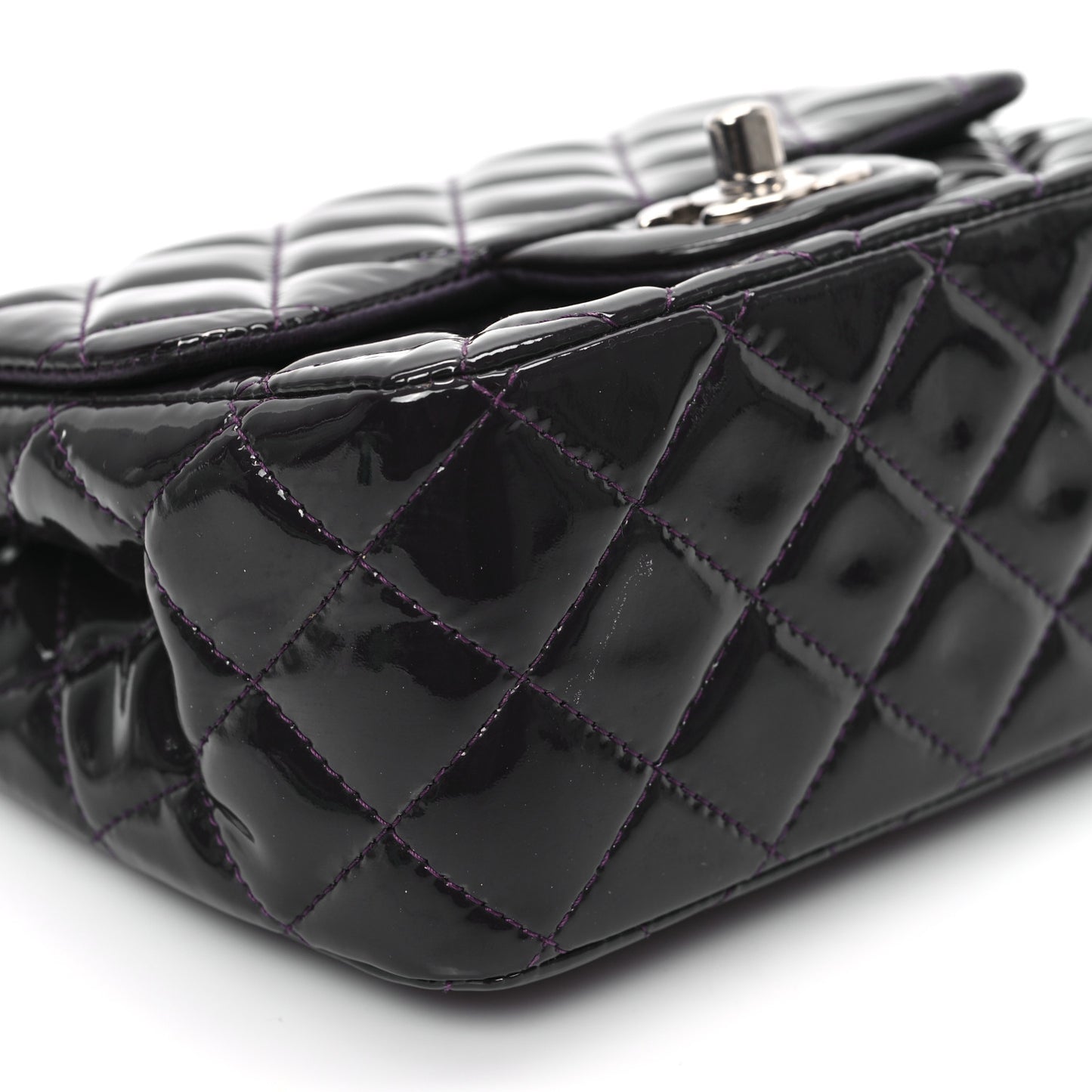 This is an authentic CHANEL Patent Quilted Mini Square Flap in Purple. This chic shoulder bag is crafted of glossy diamond quilted patent leather in purple. The bag features a lengthy patent leather threaded silver chain-link shoulder strap and a matching silver Chanel CC turn lock on the flap. This opens to a matching purple leather interior with a zipper and a patch pocket.Follow this item for alerts. Chanel is a registered trademark of Chanel. FASHIONPHILE is not affiliated with Chanel.