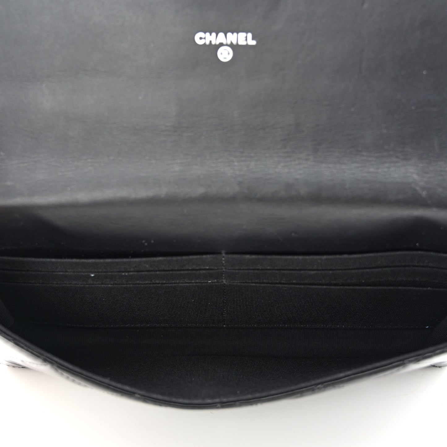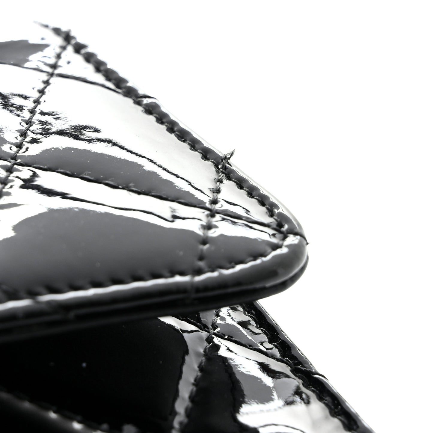 This is an authentic CHANEL Patent Quilted Travel Wallet in Black. This clutch wallet is crafted of black patent leather with signature diamond shaped quilting, and a rear flat pocket. The front flap features a silver Chanel CC logo. The front flap unsnaps to a matching leather and fabric interior with a card slot insert.Follow this item for alerts. Chanel is a registered trademark of Chanel. FASHIONPHILE is not affiliated with Chanel.
