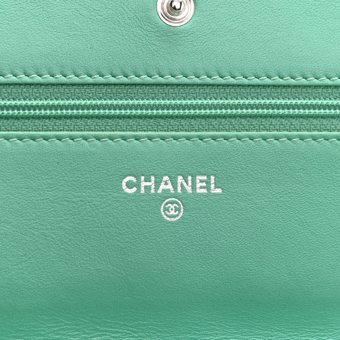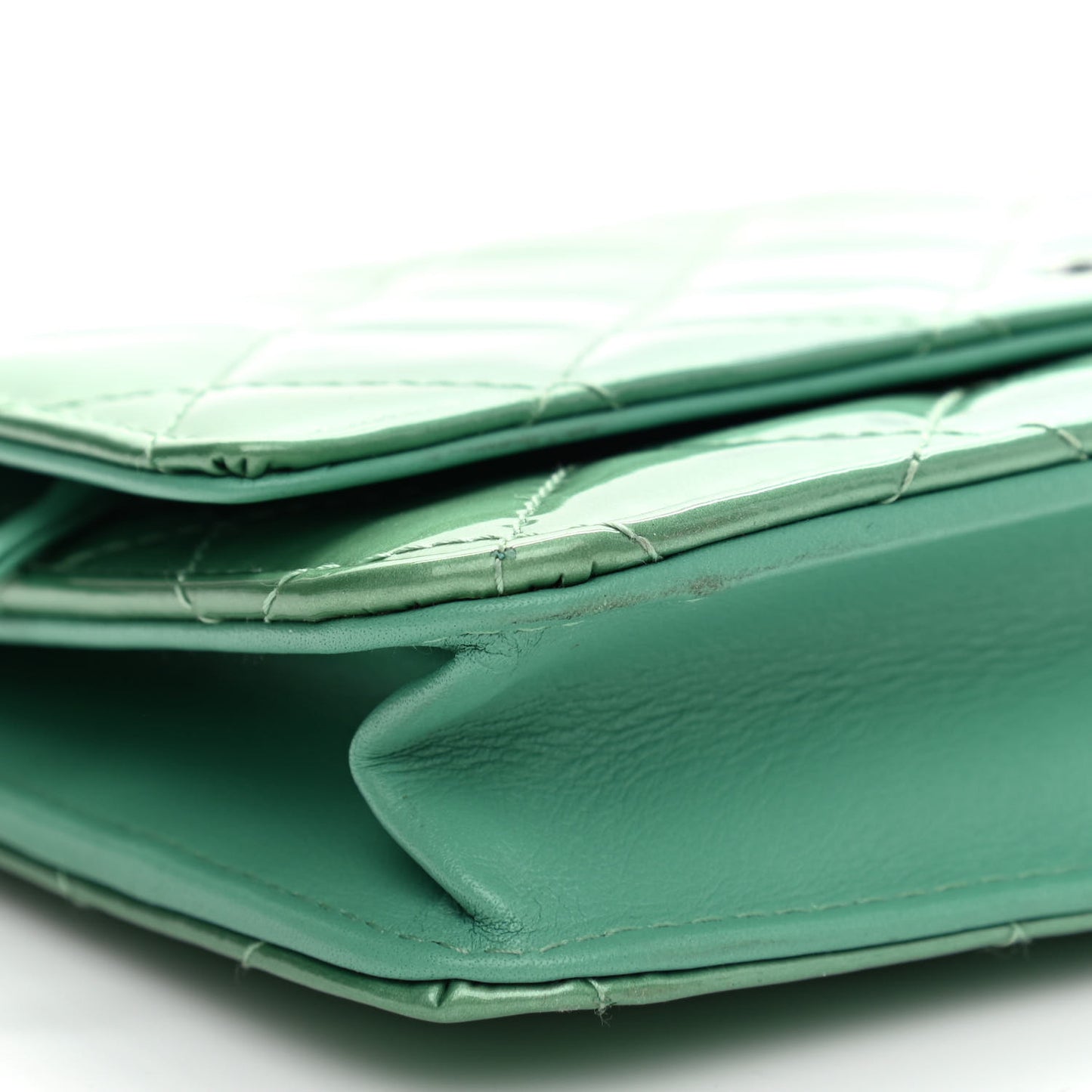 This is an authentic CHANEL Patent Quilted Wallet On Chain WOC in Light Green This stylish shoulder bag is crafted of diamond-quilted patent leather in light green. It features a leather-threaded silver shoulder chain and a facing flap with a silver CC logo. The flap opens to matching leather and fabric interior with a card slots, patch pockets, and a zipper compartment.Follow this item for alerts. Chanel is a registered trademark of Chanel. FASHIONPHILE is not affiliated with Chanel.