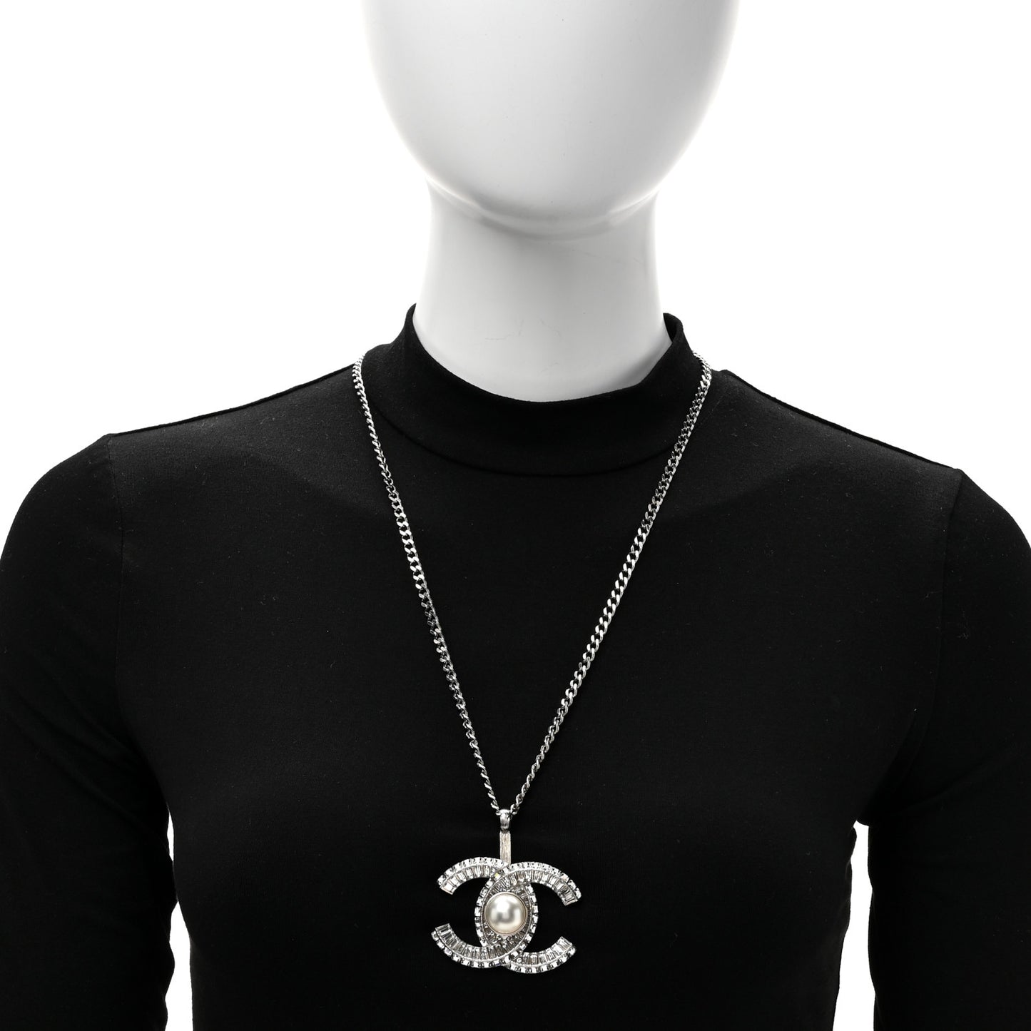 Chanel/ Jewelry/ Necklaces /Chanel Pearl Baguette Crystal Large CC Pendant Necklace Silver