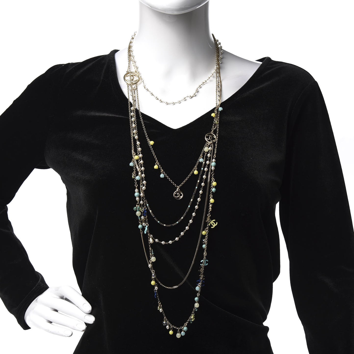 This is an authentic CHANEL Pearl Beaded Resin CC Multi Strand Long Necklace in Silver Nacre. This elegant extra long necklace features three strands of gold chains holding faux resin pearls, CC logos, and colorful lucky charms. This is a fabulous necklace with a timeless style, only from Chanel!Follow this item for alerts. Chanel is a registered trademark of Chanel. FASHIONPHILE is not affiliated with Chanel.