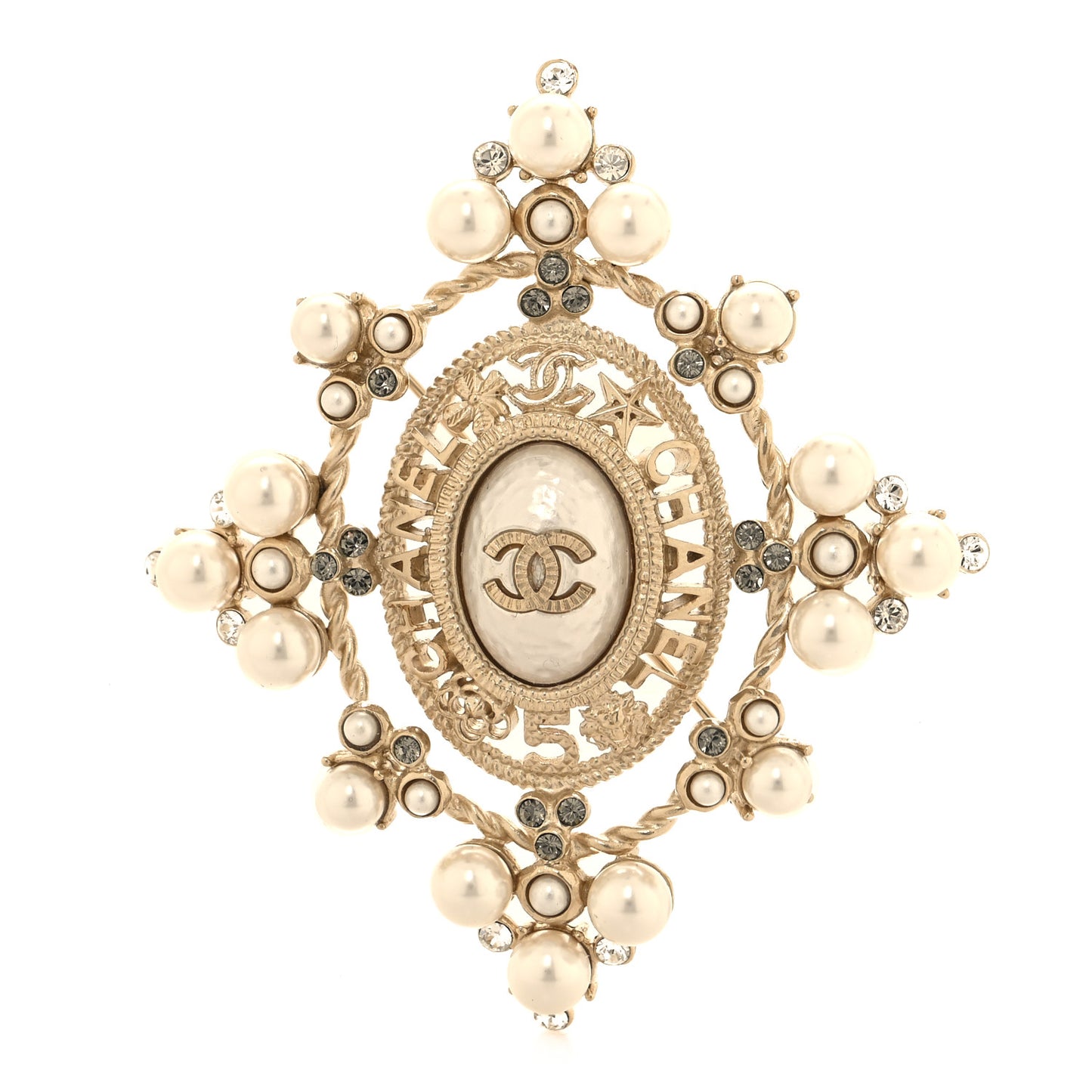 Pearl Crystal CC Brooch Gold
