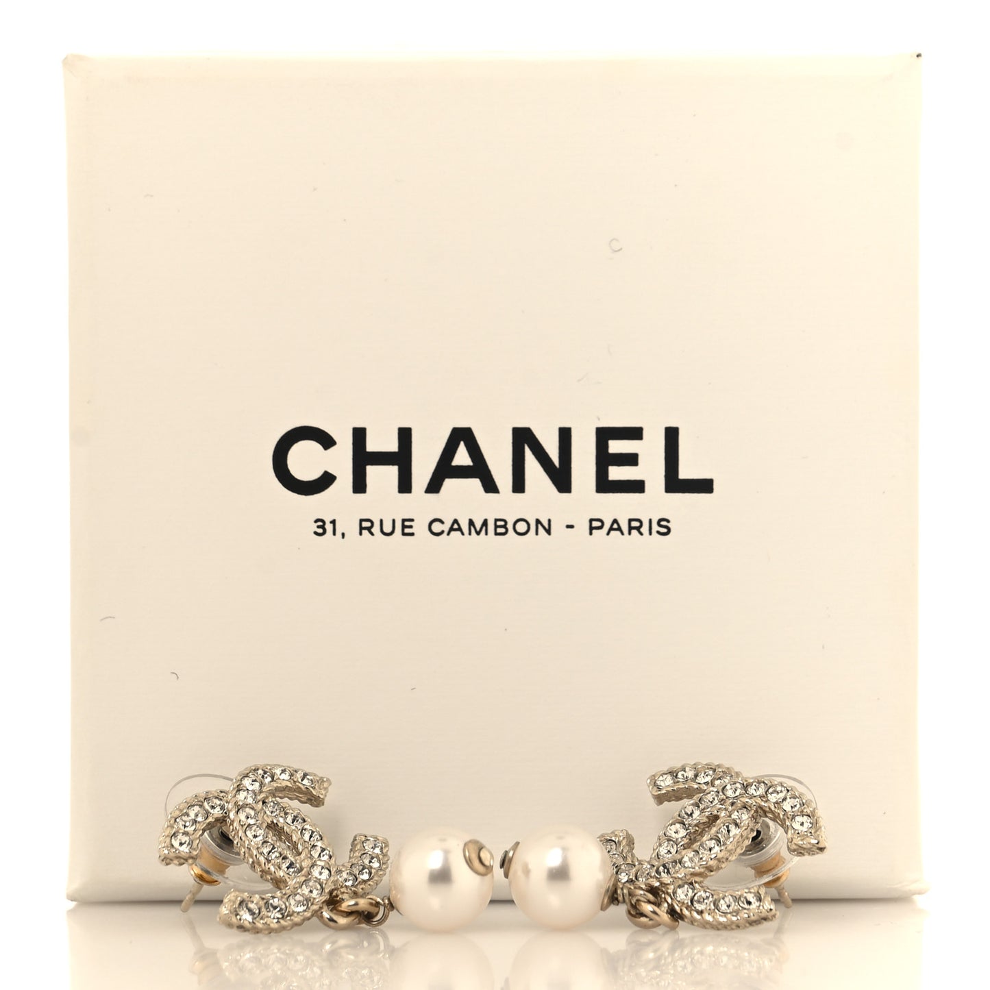 Chanel/ Jewelry/ Earrings /Chanel Pearl Crystal CC Drop Earrings Gold