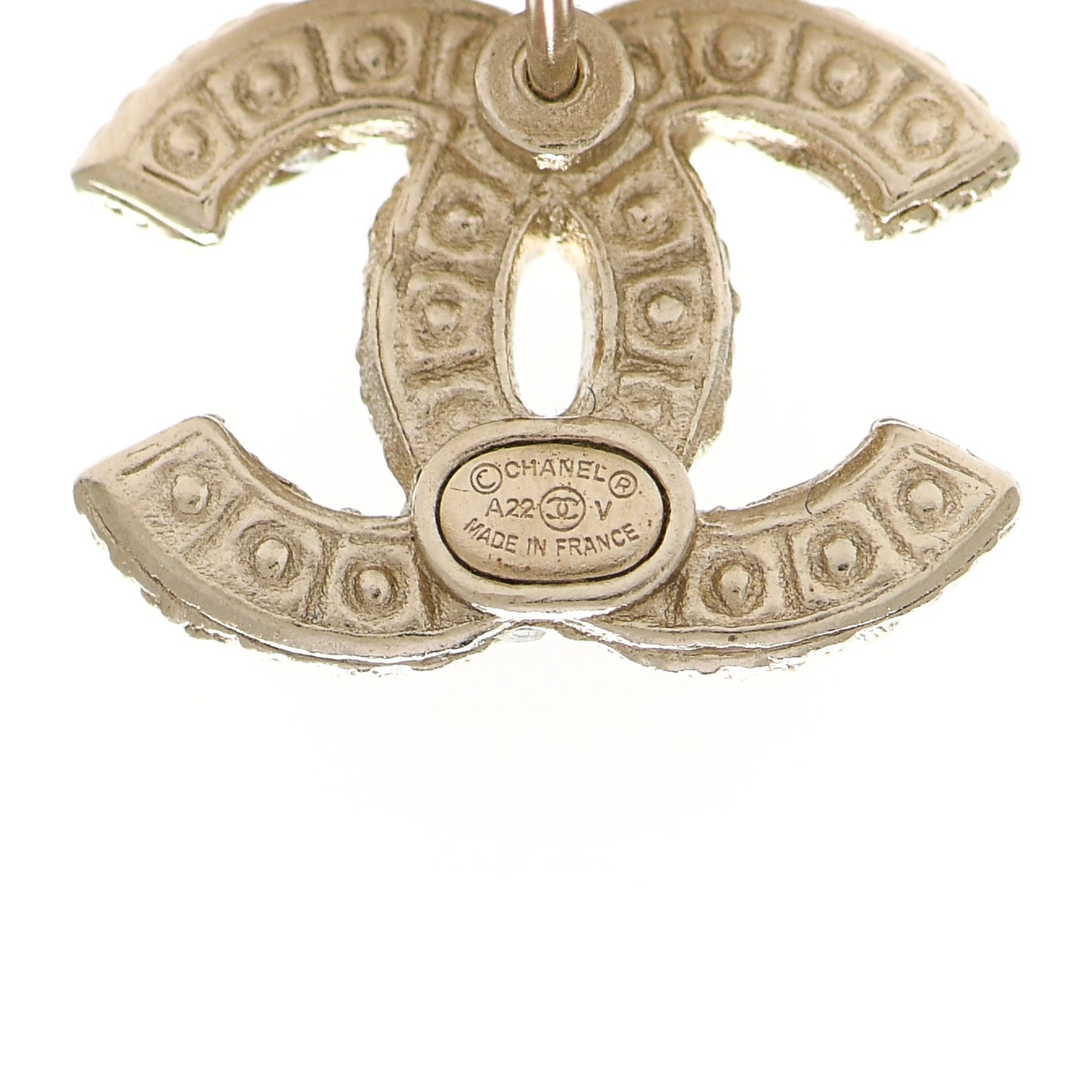 This is an authentic pair of CHANEL Pearl CC Earrings in Gold. These stylish gold earrings feature stunning crystal and pearl embellished CC logos.Follow this item for alerts. Chanel is a registered trademark of Chanel. FASHIONPHILE is not affiliated with Chanel.