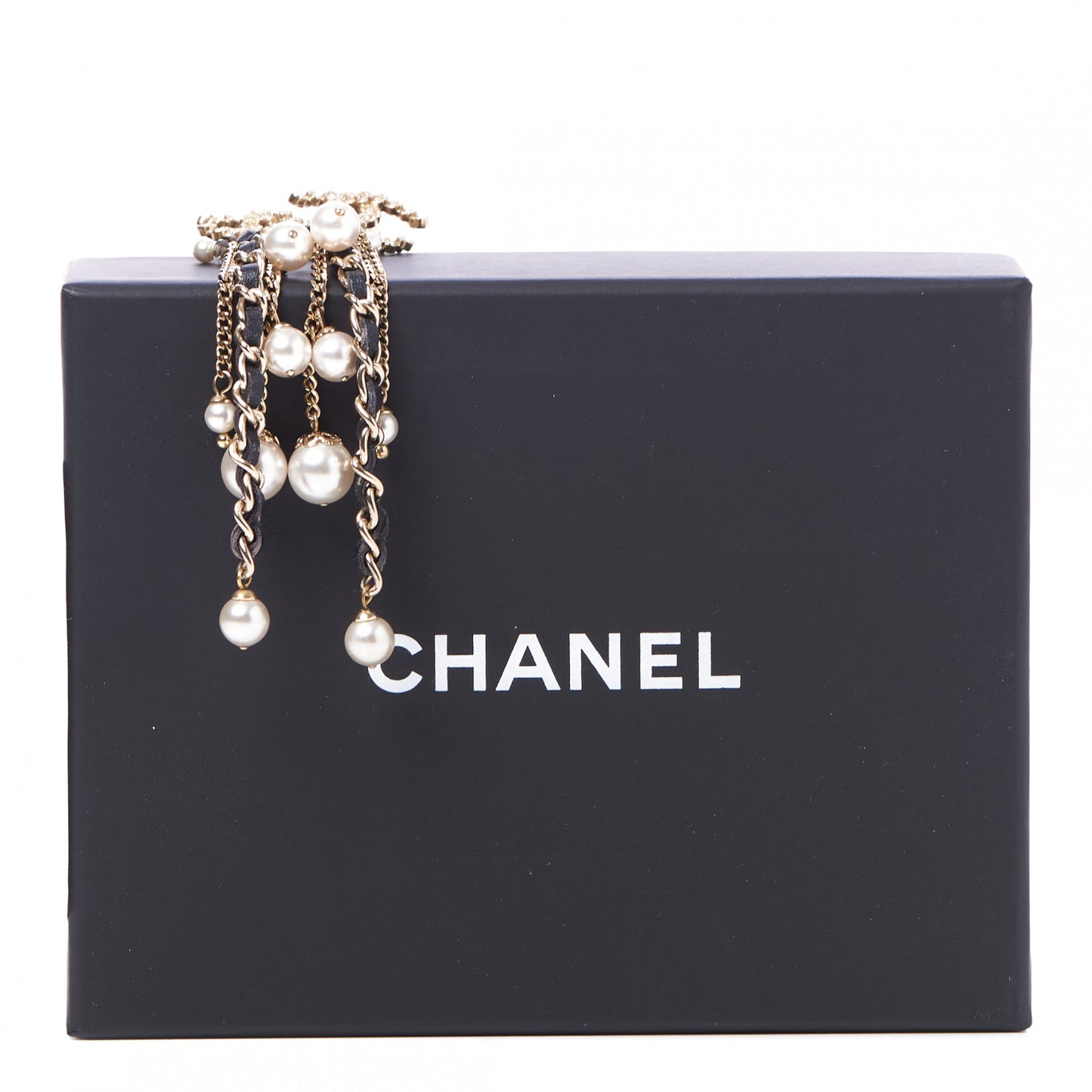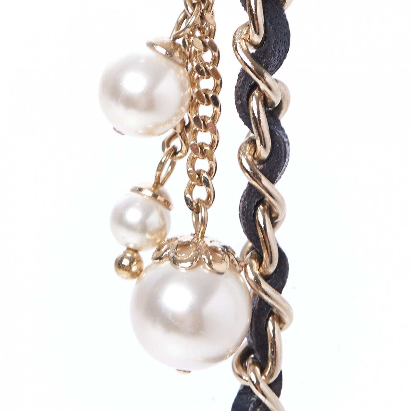 This is an authentic pair of CHANEL Pearl Crystal Lambskin Chain CC Dangle Earrings in Gold. These classic earrings feature a gold toned CC logo set with crystals, small gold chain links with delicate resin pearls, and a slightly larger gold link chain threaded with black leather.Follow this item for alerts. Chanel is a registered trademark of Chanel. FASHIONPHILE is not affiliated with Chanel.