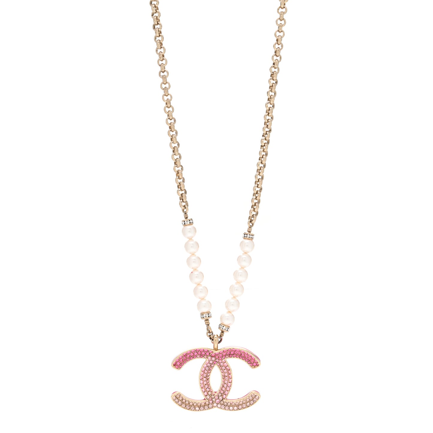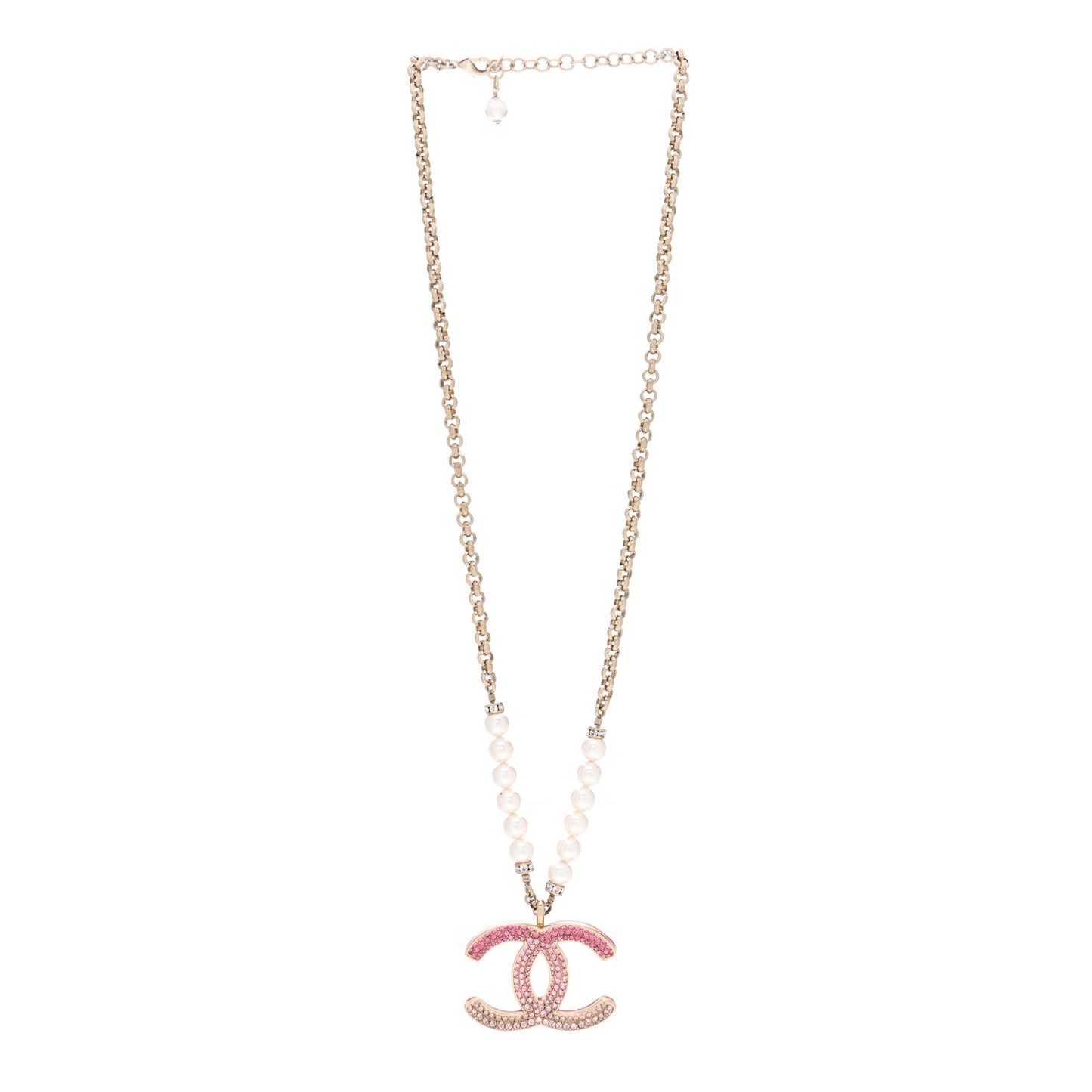 This is an authentic CHANEL Pearl Crystal Resin CC Reversible Necklace in Pink, Gold, and White. This stylish necklace is crafted with a pearl chain and features a CC logo encrusted with gradient pink to white crystals.Follow this item for alerts. Chanel is a registered trademark of Chanel. FASHIONPHILE is not affiliated with Chanel.