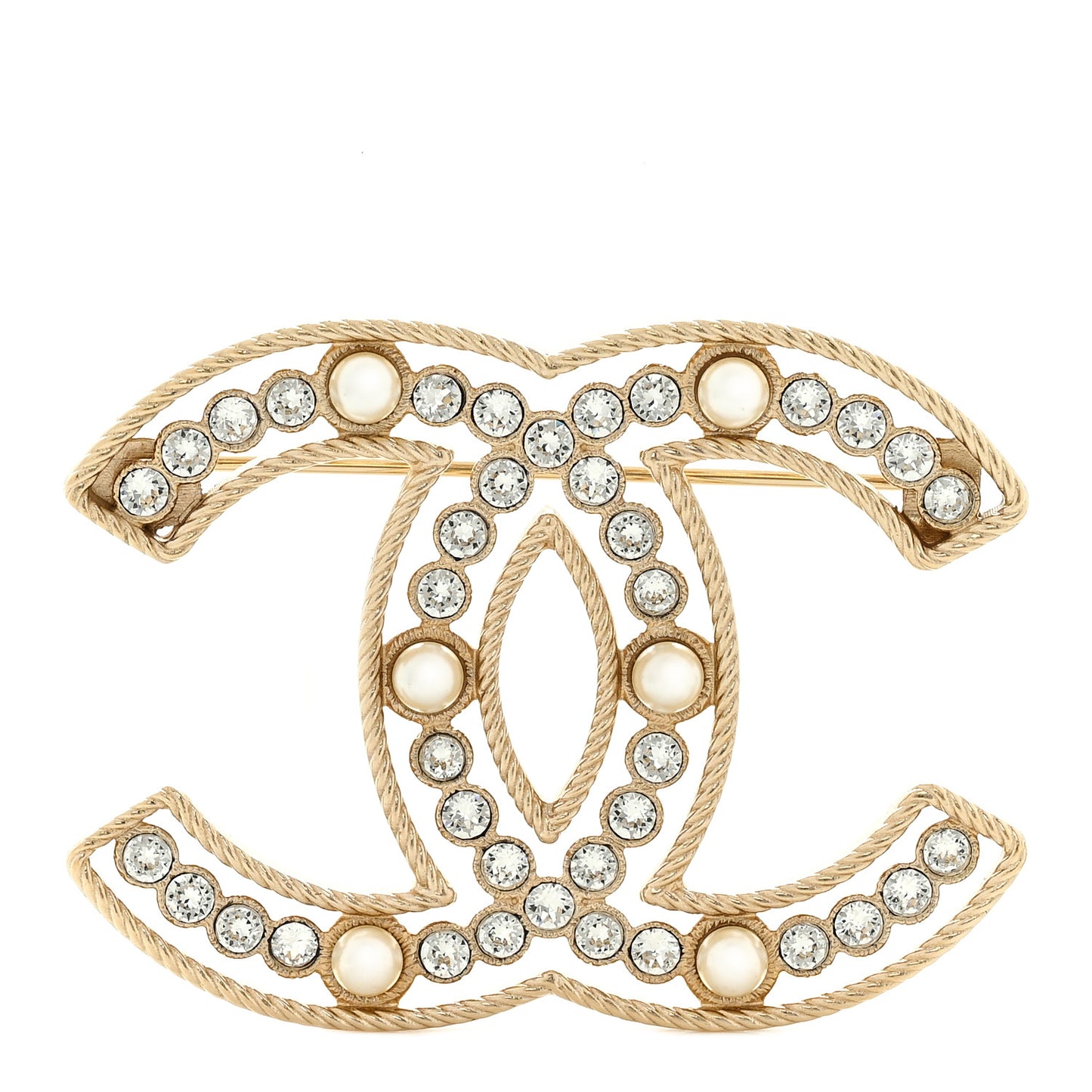 Chanel/ Accessories/ Pins & Brooches /Chanel Pearl Crystal Sparkling Pearls CC Brooch Gold