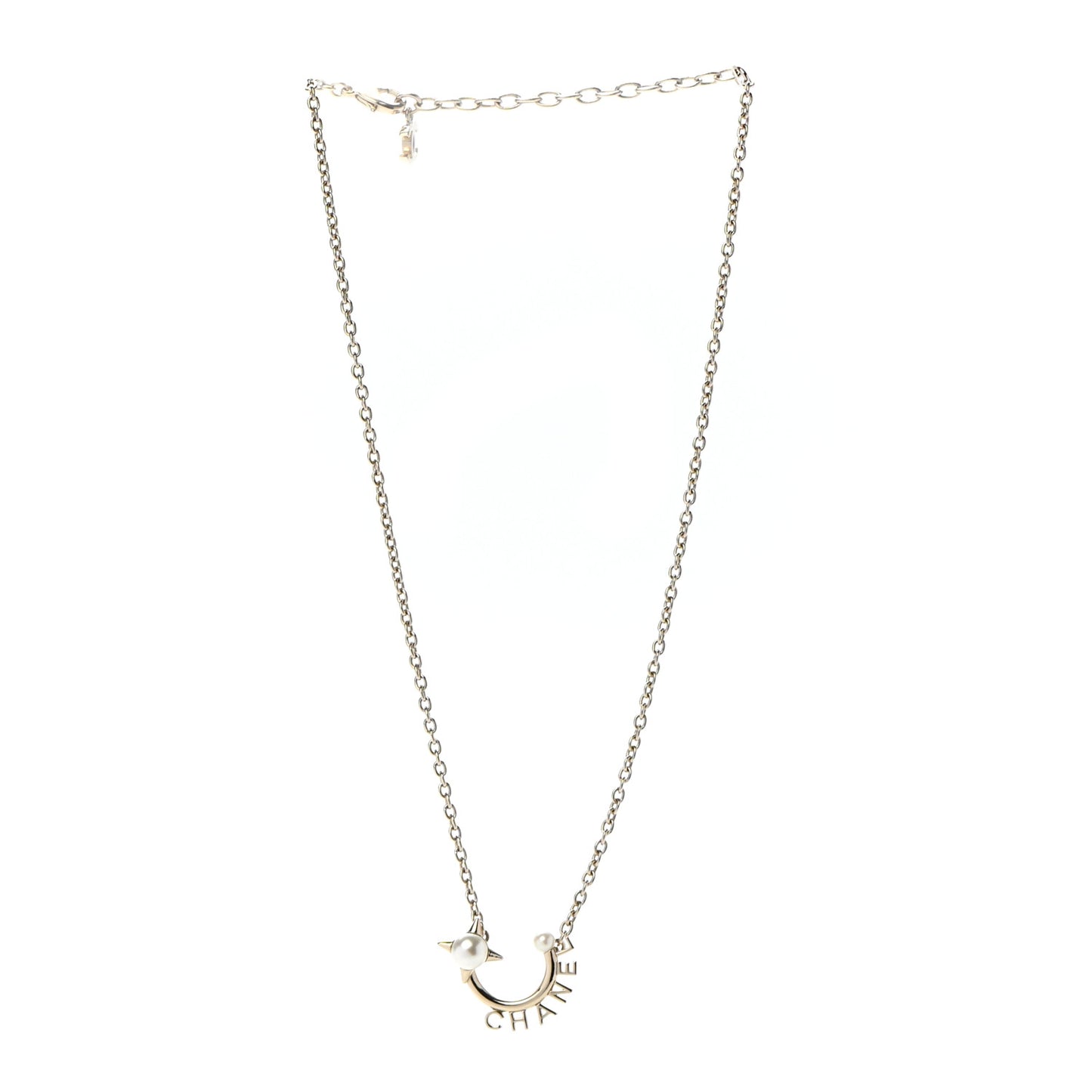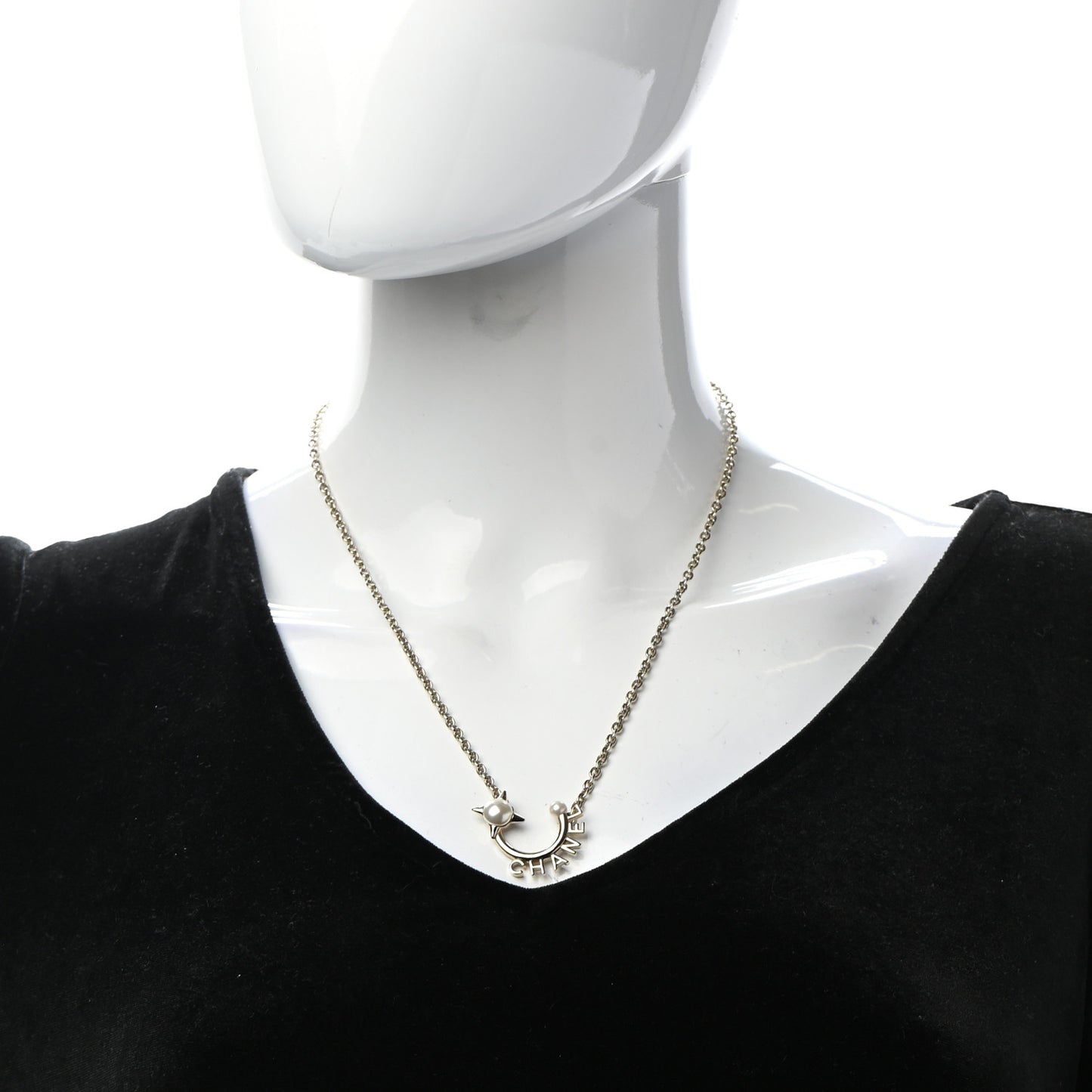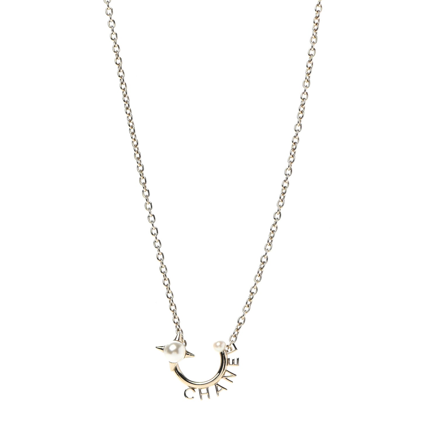 This is an authentic CHANEL Pearl Logo Necklace in Gold. This beautiful necklace is in a light gold tone chain and features a pendant with the Chanel logo and faux pearls.Follow this item for alerts. Chanel is a registered trademark of Chanel. FASHIONPHILE is not affiliated with Chanel.