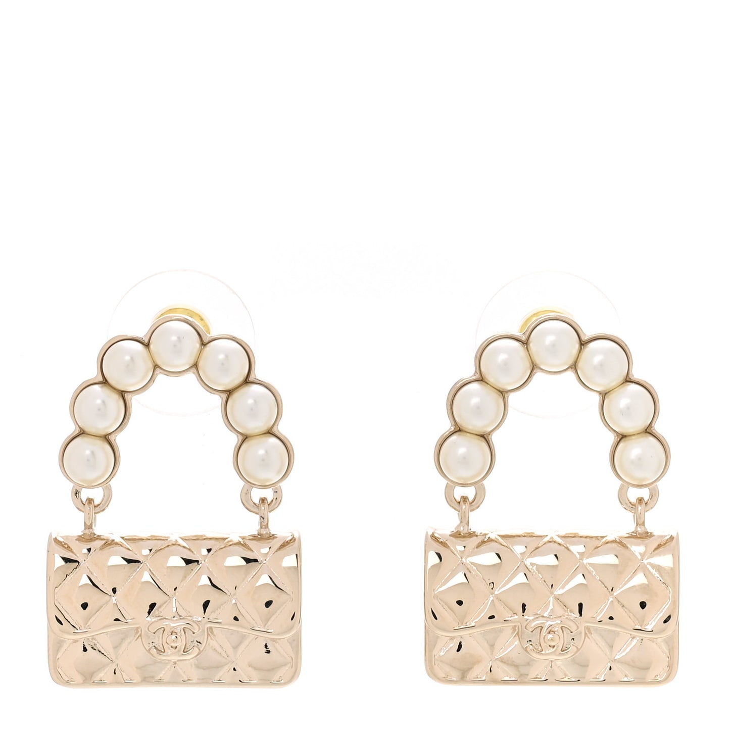 This is an authentic pair of CHANEL Pearl Quilted CC Flap Bag Earrings in Gold. These stylish gold-tone earrings feature a purse hanging with faux pearl straps.Follow this item for alerts. Chanel is a registered trademark of Chanel. FASHIONPHILE is not affiliated with Chanel.