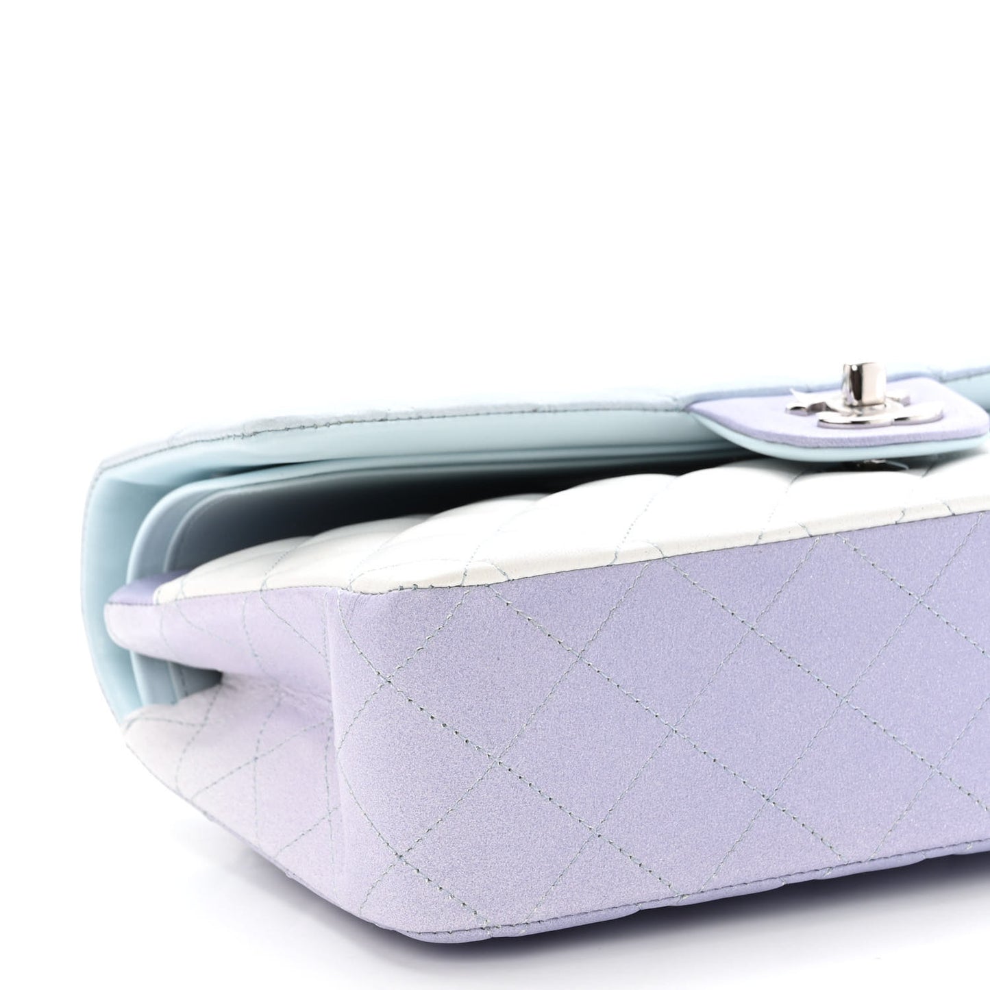 This is an authentic CHANEL Perforated Lambskin Quilted Medium Double Flap in Light Blue, Light Purple and White. This chic classic double flap is crafted of soft diamond-quilted lambskin leather in purple, blue and white. The shoulder bag features a silver chain-link leather threaded shoulder strap, a rear patch pocket, and a silver Chanel CC turn-lock on the front flap. This opens to a light blue leather interior with zipper and patch pockets.Follow this item for alerts. Chanel is a registered trademark of Chanel. FASHIONPHILE is not affiliated with Chanel.