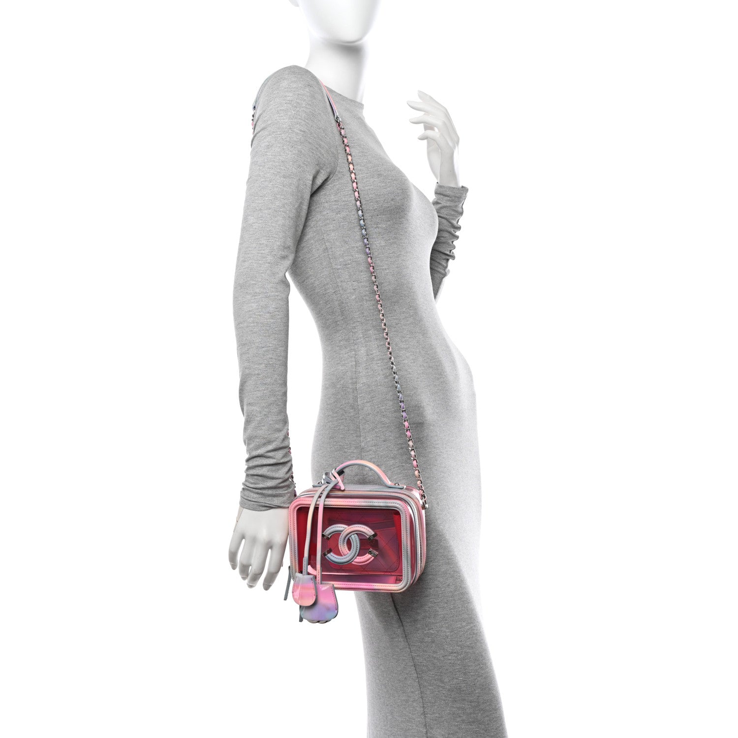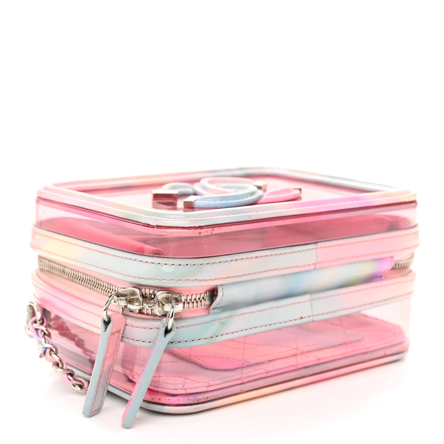 This is an authentic CHANEL PVC Patent Calfskin Patent Lambskin Small CC Vanity Case in Pink. This chic stylish crossbody bag is crafted of delightful multicolor patent leather with pink tinted transparent panels. It features a patent leather top handle, patent leather threaded chain link shoulder straps with matching patent leather shoulder pad, and a large Chanel CC stitched logo with silver tips on the front. The two top zippers open all around to an interior with a zipper pocket and card slots.Follow this item for alerts. Chanel is a registered trademark of Chanel. FASHIONPHILE is not affiliated with Chanel.