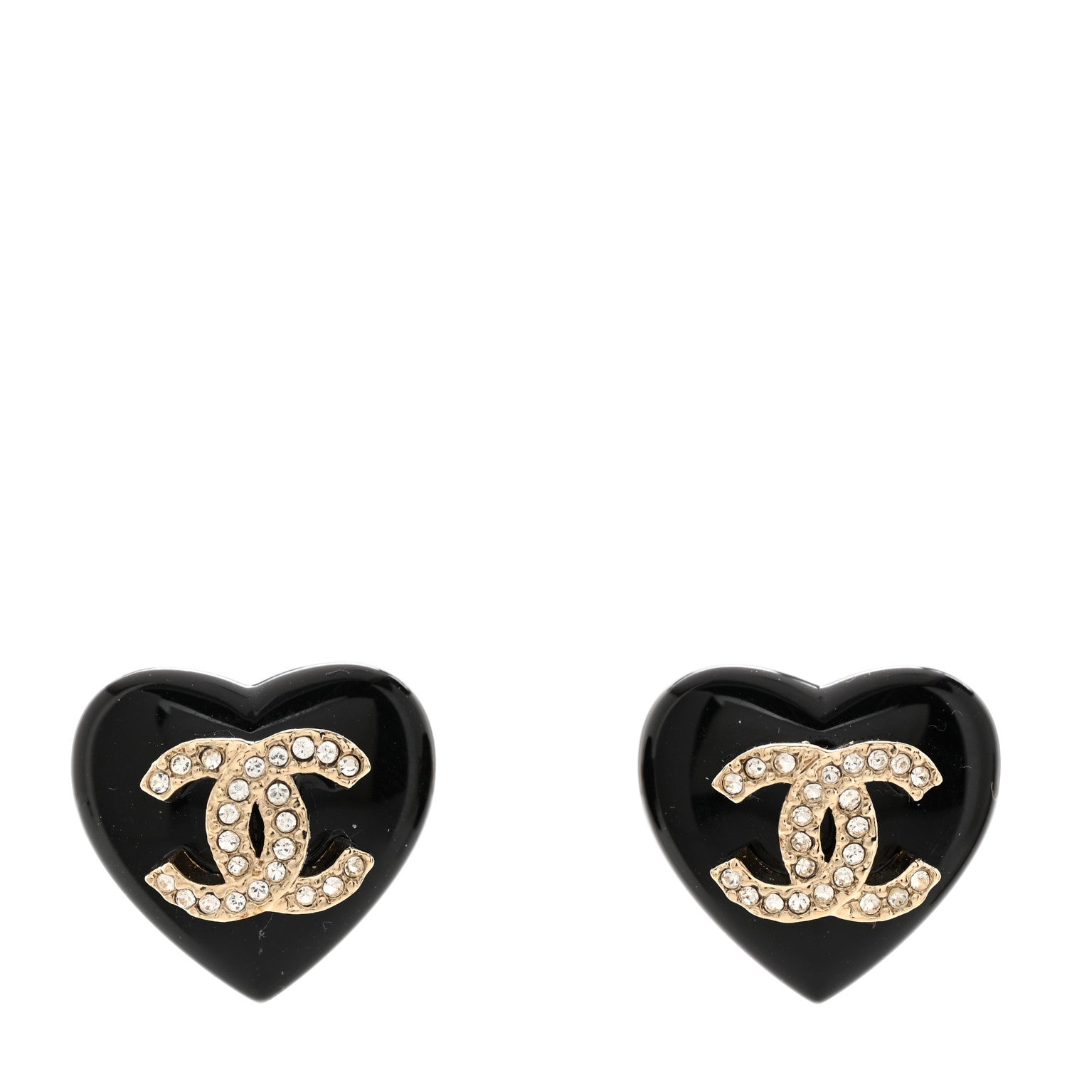 This is an authentic pair of CHANEL Resin Crystal CC Heart Earrings in Black and Gold. These luxurious earrings is gold tone with black resin and crystal CC logo.Follow this item for alerts. Chanel is a registered trademark of Chanel. FASHIONPHILE is not affiliated with Chanel.