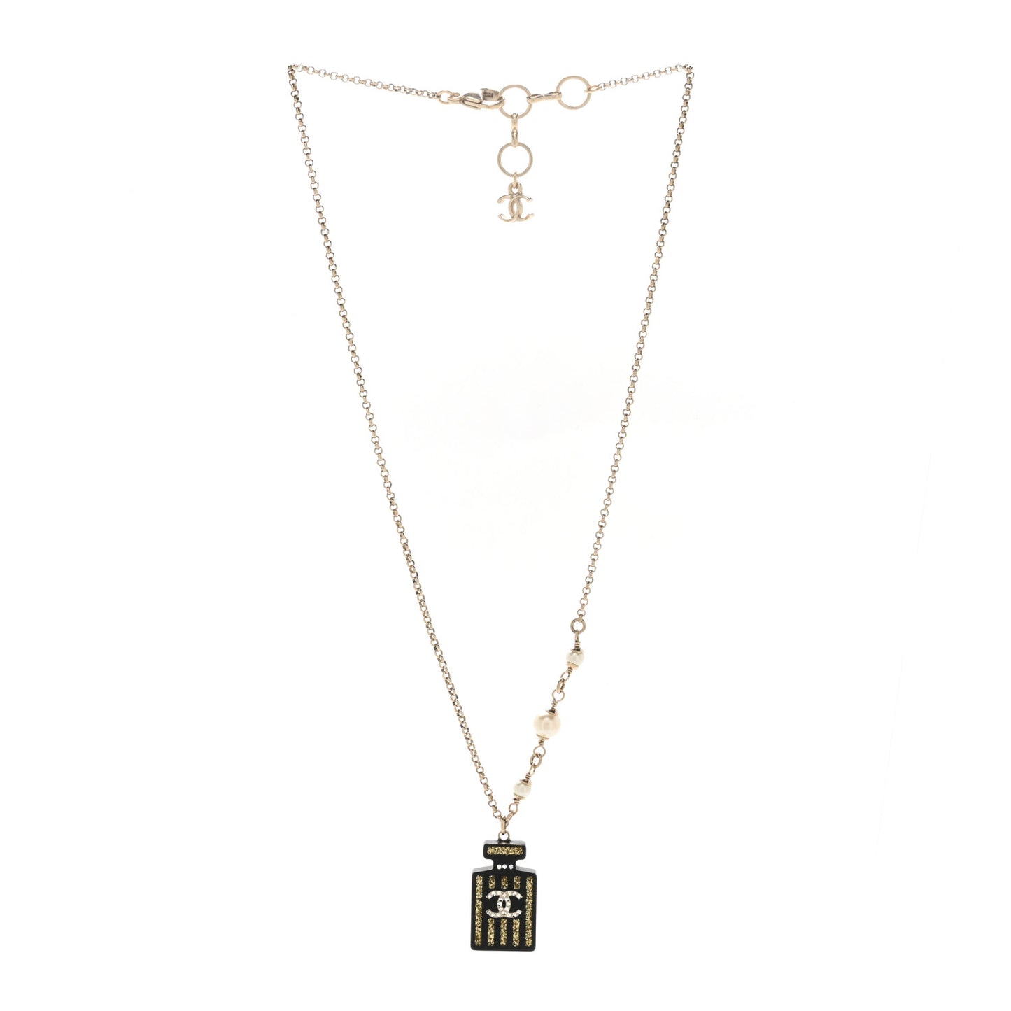 Chanel/ Jewelry/ Necklaces /Chanel Resin Strass Pearl Perfume Bottle CC Necklace Black Gold