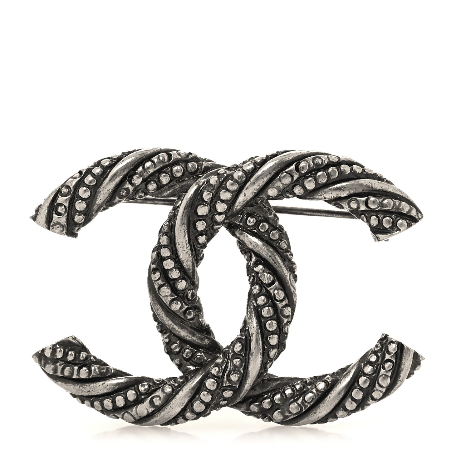 This is an authentic CHANEL Ruthenium Twisted CC Brooch in Silver. This beautiful brooch features a large dark silver-tone Chanel CC logo with a twisted texture.Follow this item for alerts. Chanel is a registered trademark of Chanel. FASHIONPHILE is not affiliated with Chanel.