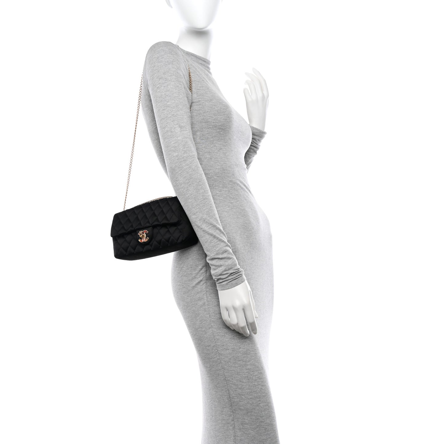 This is an authentic CHANEL Satin Quilted Precious Jewel East West Flap in Black. This stylish evening bag is crafted of diamond quilted black satin. The bag features gold bijoux chain link shoulder straps and a frontal flap with a CC turn lock with gold-tone jewel-encrusted CC turn lock that opens to a satin interior with patch pockets.Follow this item for alerts. Chanel is a registered trademark of Chanel. FASHIONPHILE is not affiliated with Chanel.