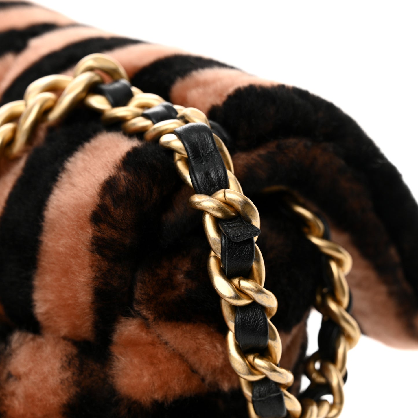 This is an authentic CHANEL Shearling Striped Medium Chanel 19 Flap in Black and Beige. This shoulder bag is crafted of striped shearling in beige and black. The refined bag features an aged gold chain detail CC turn lock on the flap, a magnetic snap pocket at the rear, and a leather threaded aged gold, ruthenium, and dark silver chain link shoulder strap with a leather shoulder pad. The front flap opens to a black fabric interior with a pocket.Follow this item for alerts. Chanel is a registered trademark of Chanel. FASHIONPHILE is not affiliated with Chanel.
