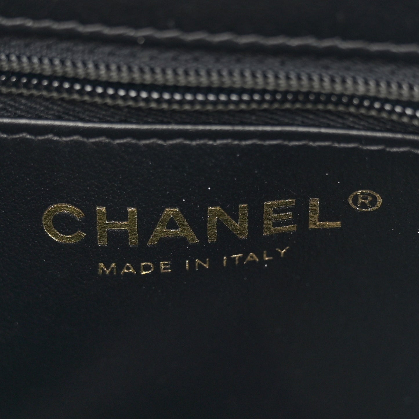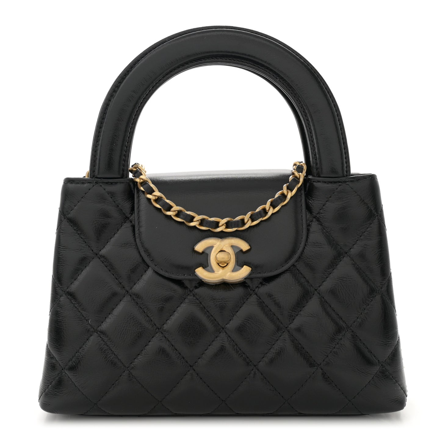 This is an authentic CHANEL Shiny Aged Calfskin Quilted Nano Kelly Shopper in Black. This mini bag is a twist on an archival Chanel bag, featuring a long crossbody chain strap. This dual top handle bag is quilted in shiny aged calfskin leather in black, accented by aged gold hardware, including a Chanel CC turn-lock at the flap. This opens to a compact black leather interior with zipper and flat pockets.Follow this item for alerts. Chanel is a registered trademark of Chanel. FASHIONPHILE is not affiliated with Chanel.