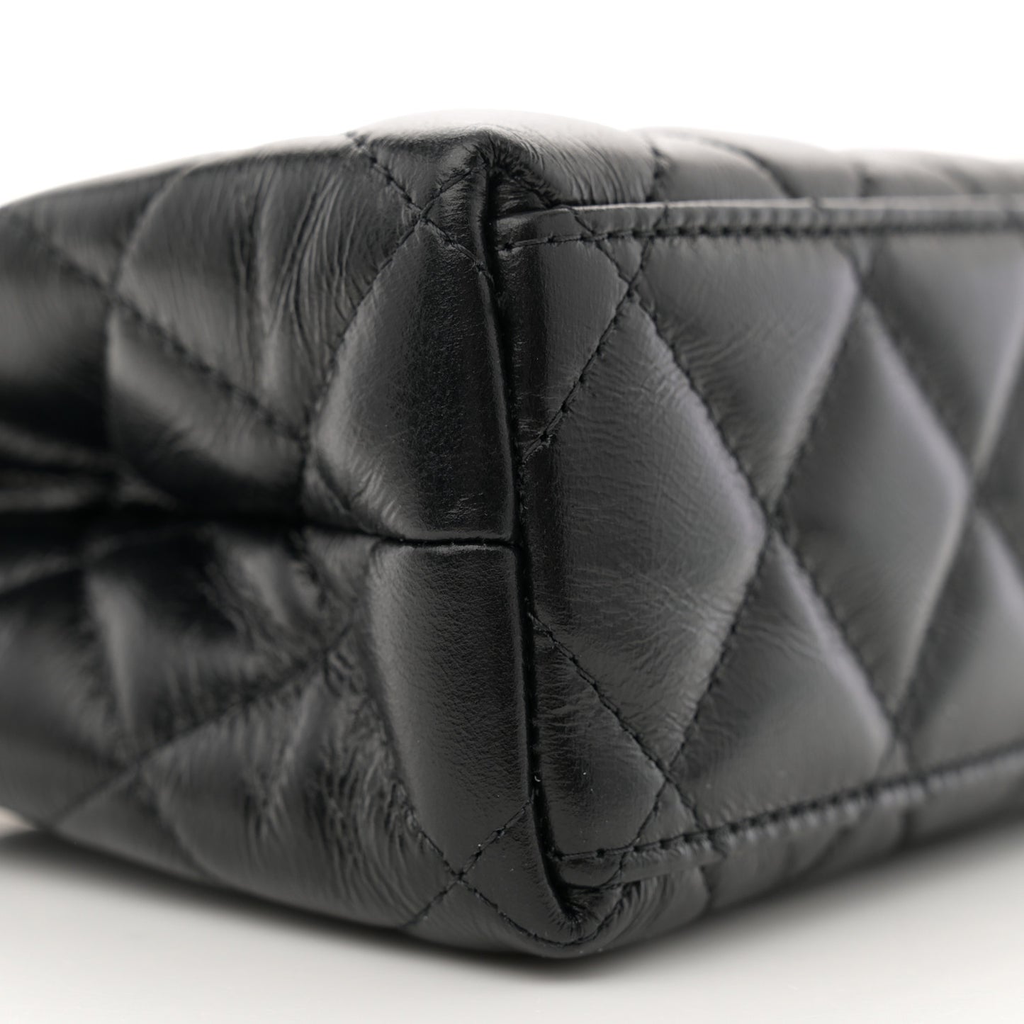This is an authentic CHANEL Shiny Aged Calfskin Quilted Nano Kelly Shopper in Black. This mini bag is a twist on an archival Chanel bag, featuring a long crossbody chain strap. This dual top handle bag is quilted in shiny aged calfskin leather in black, accented by aged gold hardware, including a Chanel CC turn-lock at the flap. This opens to a compact black leather interior with zipper and flat pockets.Follow this item for alerts. Chanel is a registered trademark of Chanel. FASHIONPHILE is not affiliated with Chanel.
