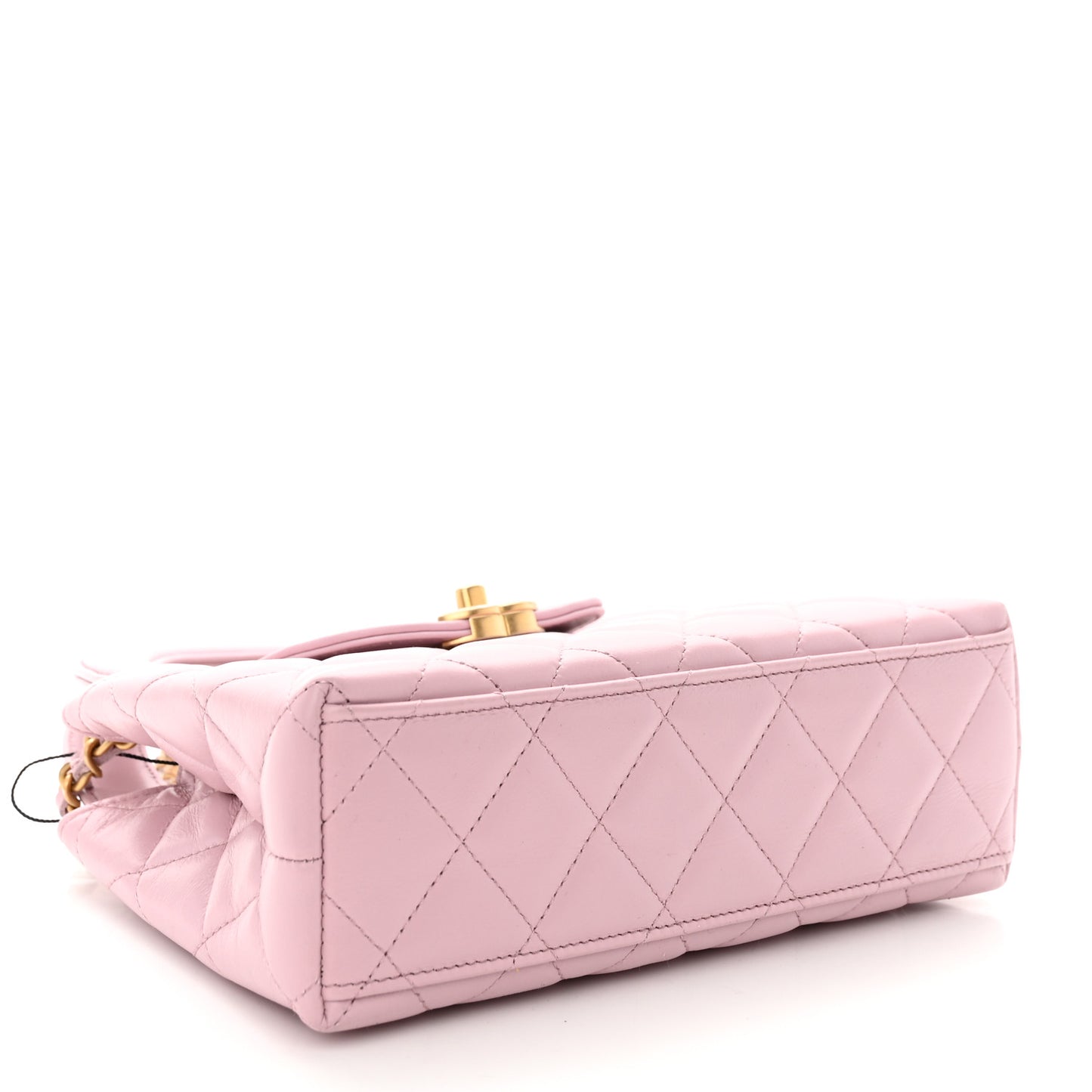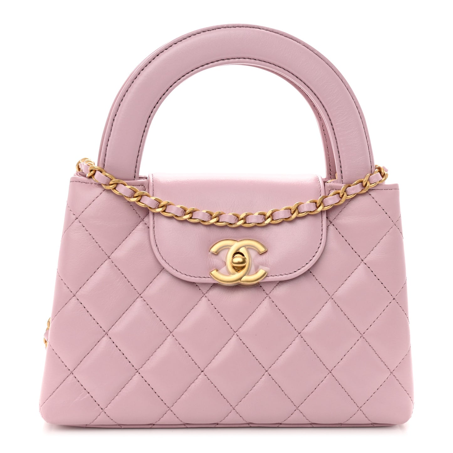 This is an authentic CHANEL Shiny Aged Calfskin Quilted Nano Kelly Shopper in Pink. This mini bag is a twist on an archival Chanel bag, featuring a long crossbody chain strap. This dual top handle bag is quilted in shiny aged calfskin leather in light pink, accented by aged gold hardware, including a Chanel CC turn-lock at the flap. This opens to a compact matching leather interior with zipper and flat pockets.Follow this item for alerts. Chanel is a registered trademark of Chanel. FASHIONPHILE is not affiliated with Chanel.
